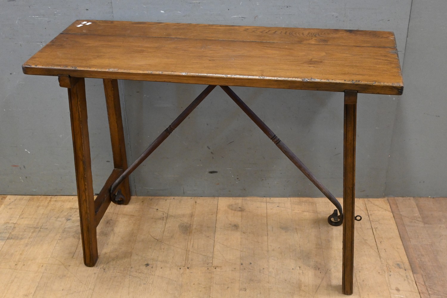 A SPANISH STYLE OAK CONSOLE WITH WROUGHT IRON BASE ( 83H X 117W X 45D CM) (LEONARD JOEL DELIVERY SIZE: LARGE)