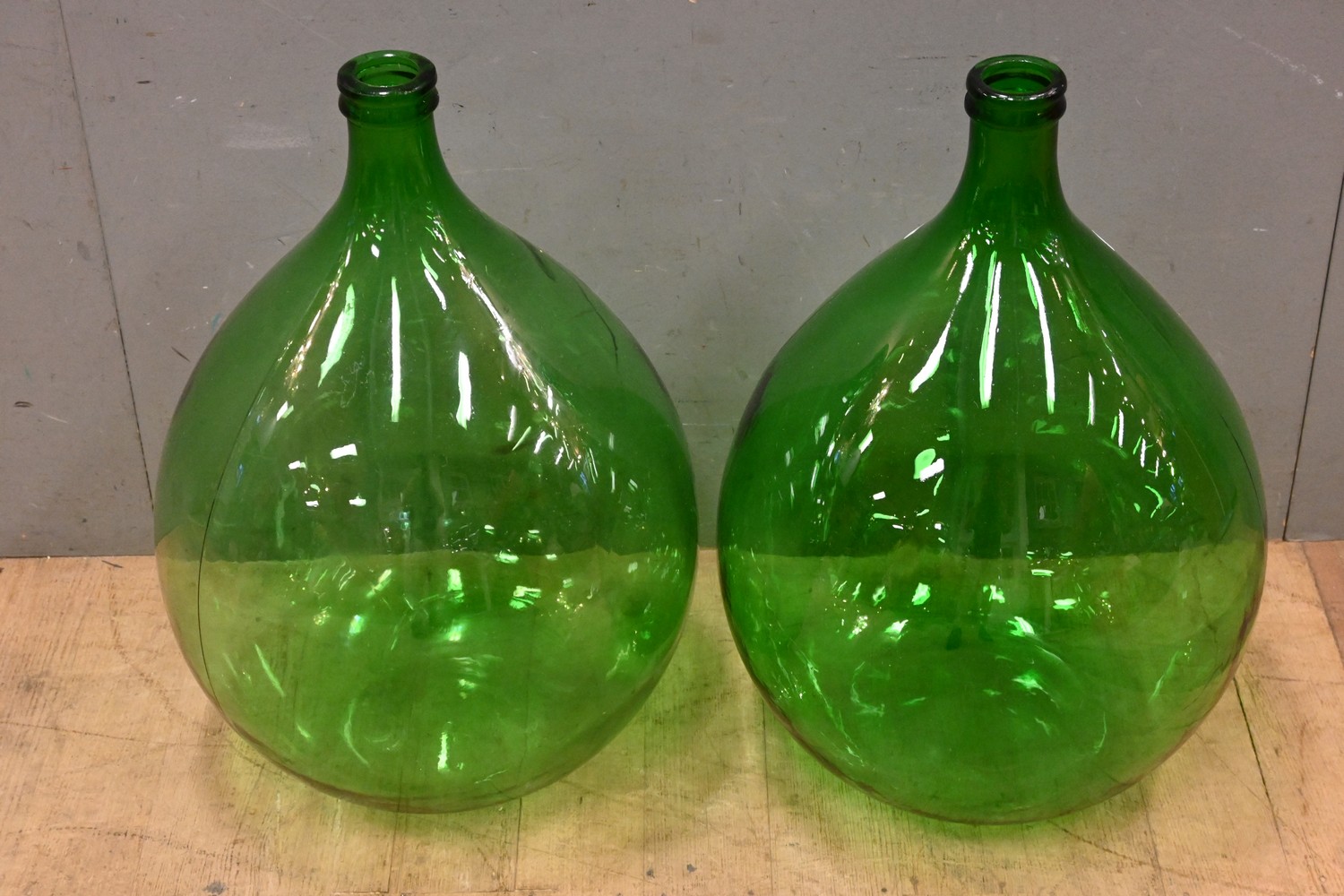 TWO GREEN GLASS DEMIJOHNS ( 66H CM) (LEONARD JOEL DELIVERY SIZE: LARGE)