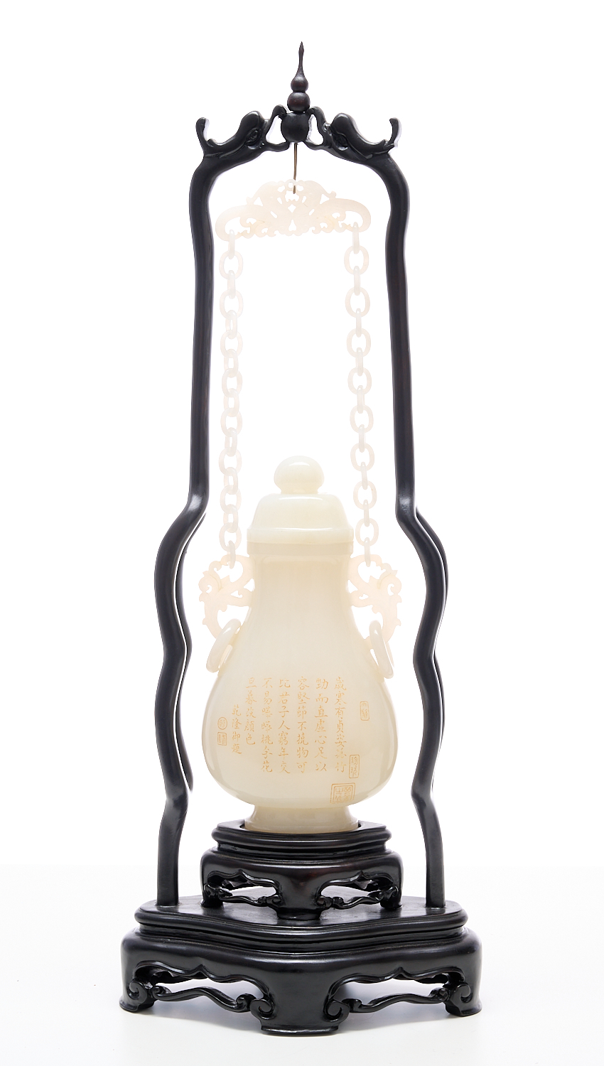 A CHINESE INSCRIBED WHITE JADE HANGING VASE WITH HARDWOOD STAND, LEONARD JOEL LOCAL DELIVERY SIZE: MEDIUM