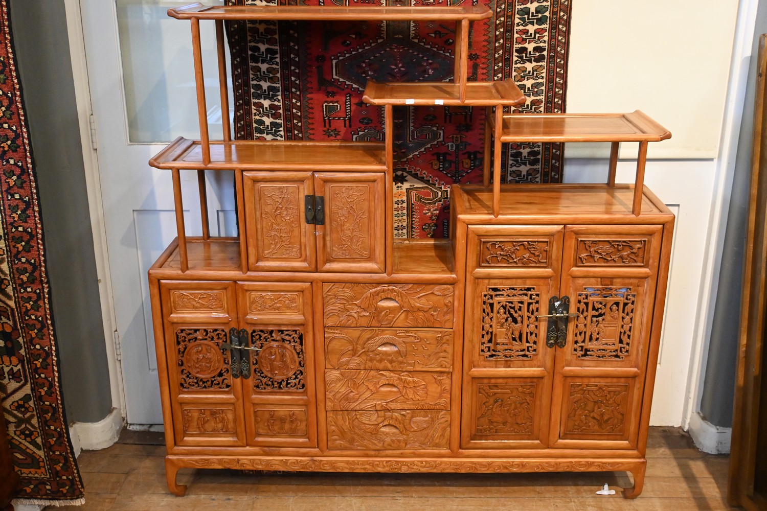 A CHINESE DECORATIVELY CARVED CABINET (151H x 151W x 32D CM) (PLEASE NOTE THIS HEAVY ITEM MUST BE REMOVED BY CARRIERS AT THE CUSTOMER'S EXPENSE. LEONARD JOEL STAFF CANNOT ASSIST CARRYING THIS ITEM) (X-LARGE ITEM)