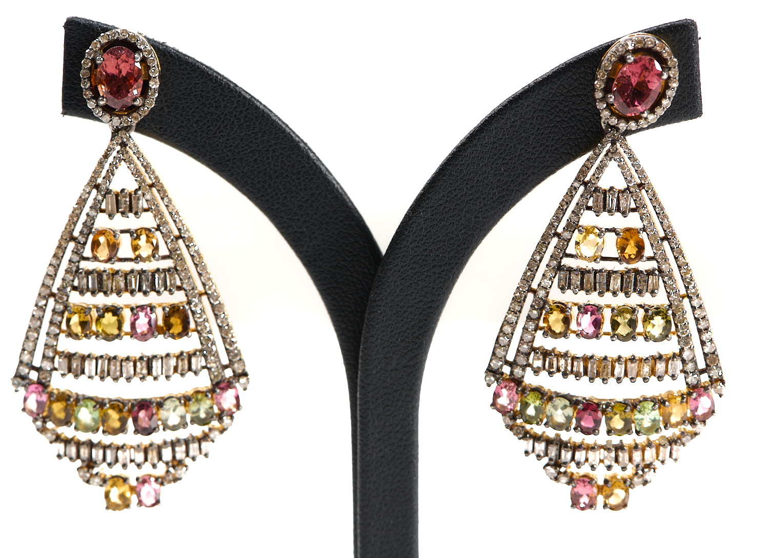 A PAIR OF TOURMALINE AND DIAMOND SET EARRINGS TO GOLD PLATED STERLING SILVER STUD POSTS