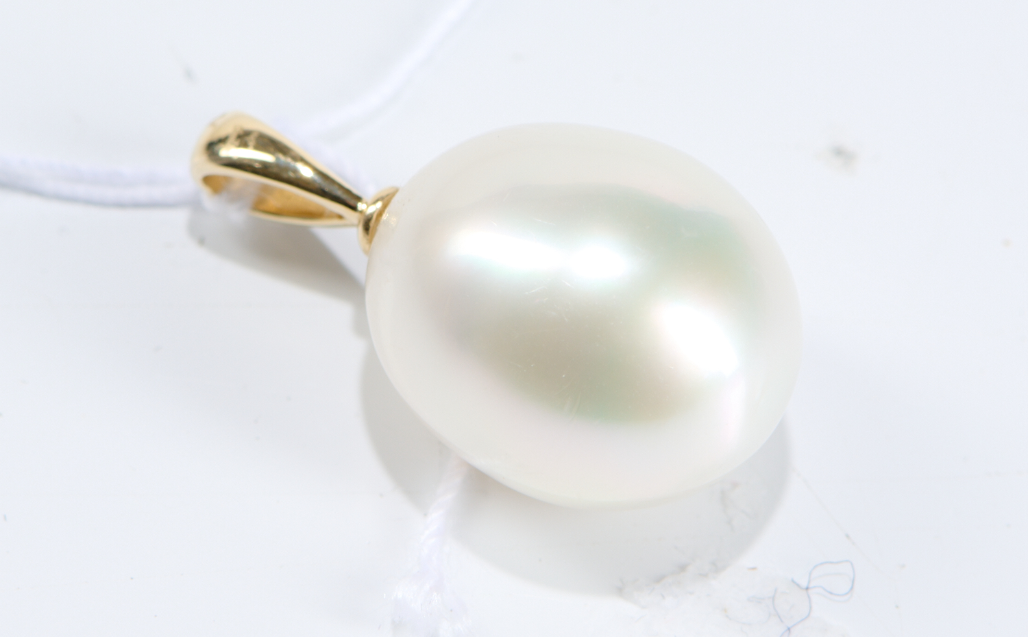 A SOUTH SEA PEARL PENDANT TO A 9CT GOLD BAIL, THE PEARL MEASURING 13.4MM