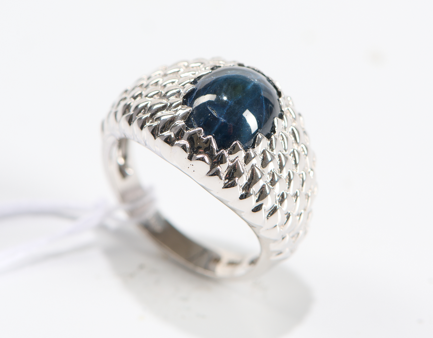 A STAR SAPPHIRE SET RING IN 18CT WHITE GOLD, SIZE N-O, 8.23GMS