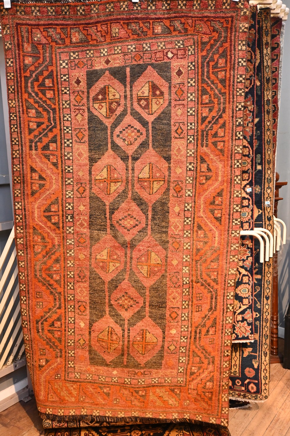 A CIRCA 1970'S TRIBAL PERSIAN KOHI RUG. 100% WOOL & WEFT PILE, NATURAL DYES. CAUCASIAN INFLUENCED HAND-KNOTTED TRIBAL KOHI WEAVE WITH A PANEL HEXAGONAL DESIGN CONTAINING CROSSES IN MULTI COLOURED FORMS BORDER OF TRIBAL MOTIFS IN SOFT MELLOW COLOURS. SIZE: 234 X 125CM. DOCUMENTATION OF AUTHENTICITY INCLUDED ORIGIN: PERSIA – RRP: $2,400