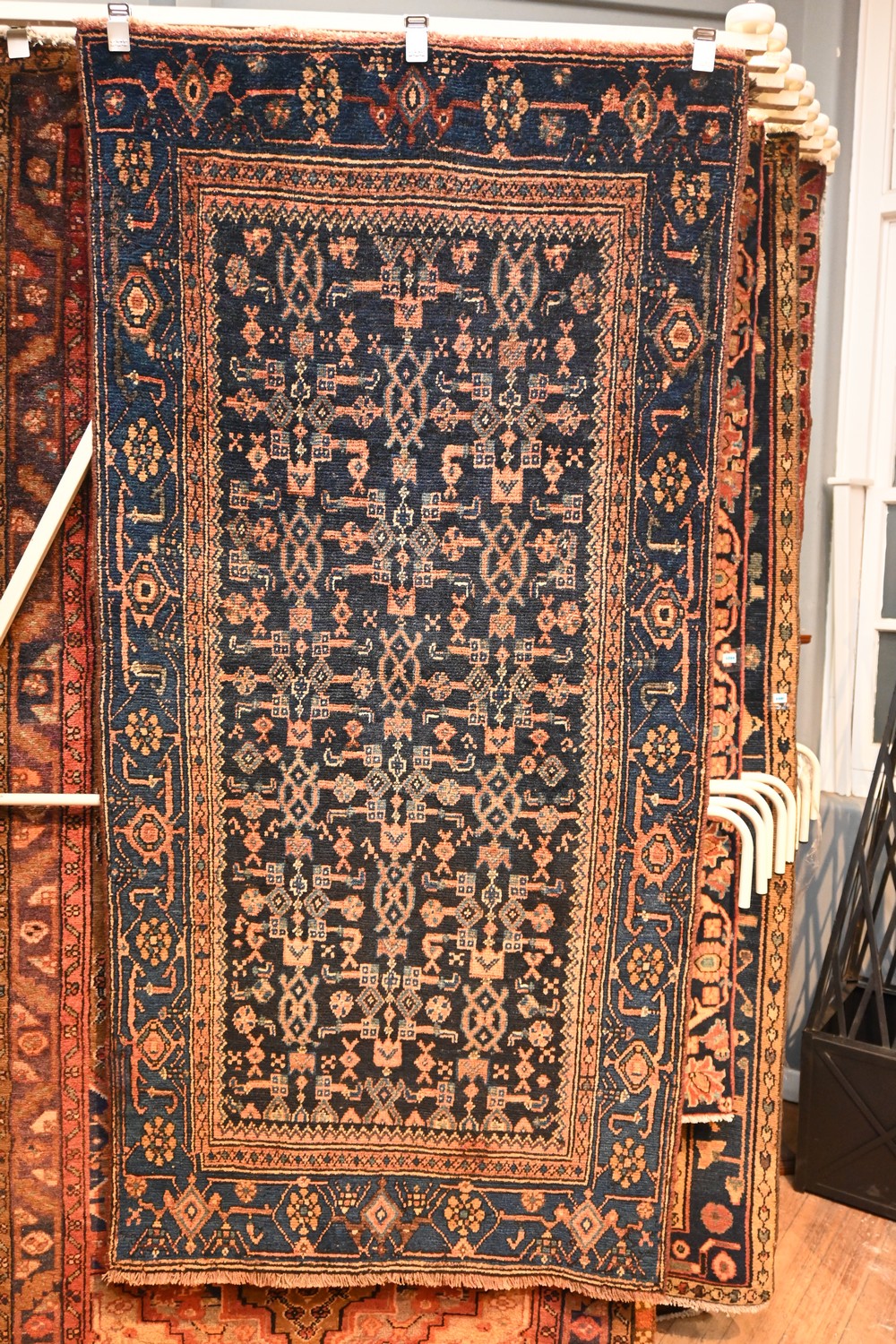 A CIRCA 1960's TRIBAL PERSIAN BIDJAR RUG. 100% WOOL. NATURAL DYES. VINTAGE PILE. HAND-KNOTTED TRIBAL WEAVE WITH ALL OVER HERATI & TRIBAL PATTERNS ON A ROYAL BLUE FIELD. BORDER OF ROSETTES AND TRIBAL MOTIFS. SIZE: 205 X 100CM DOCUMENTATION OF AUTHENTICITY INCLUDED. ORIGIN: PERSIA - RRP: $1,900