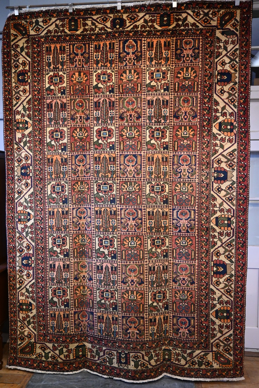 A CIRCA 1970'S TRIBAL PERSIAN BAKHTIAR SAMAN RUG, 100% WOOL. NATURAL DYES. SOLID VINTAGE PILE. STURDY & HARD-WEARING. HAND-KNOTTED TRIBAL BAKHTIARI WEAVE OF GARDEN DESIGN. BORDER OF MOTIFS & FLORAL PATTERNS. SOFT MELLOW COLOURS. RESTORED TO GALLERY CONDITION. DOCUMENTATION OF AUTHENTICITY INCLUDED. SIZE: 313 X 211CM ORIGIN: PERSIA – RRP: $3,900