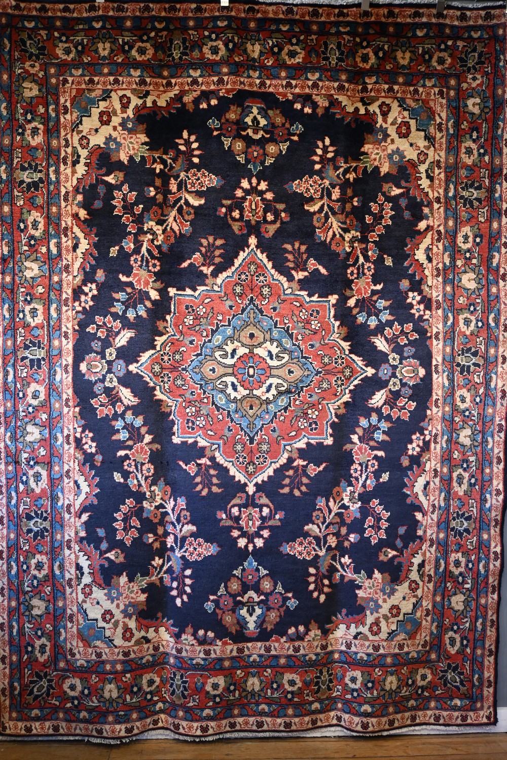 A FABULOUS PERSIAN MEHRABAN RUG, 100% WOOL PLUSH PILE. STURDY & HARD-WEARING. HAND-KNOTTED CITY WEAVE WITH TRADITIONAL DESIGN OF CENTRAL BOLD FLORAL MEDALLION AND QUARTERED CORNER MEDALLIONS ON A NAVY-BLUE FIELD WITH ALL OVER FLORAL SPRAYS. BORDER OF FLORAL MOTIFS. DOCUMENTATION OF AUTHENTICITY INCLUDED. SIZE: 308 X 223CM ORIGIN: PERSIA - RRP: $4,100