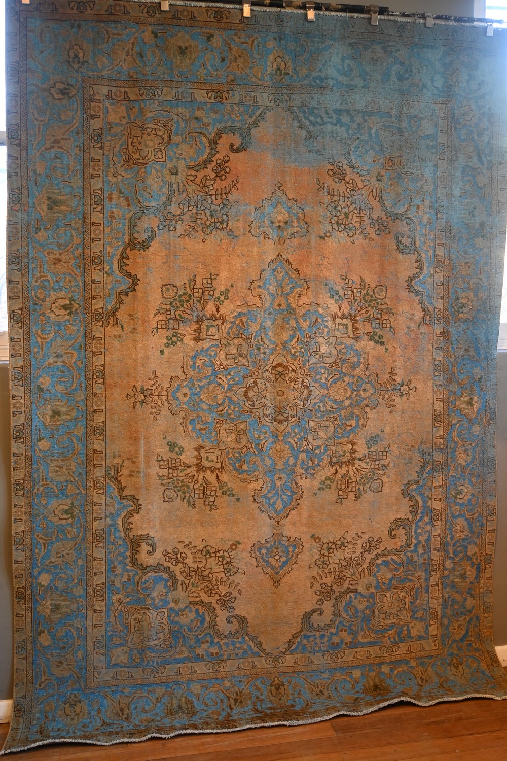 A UNIQUE MODERN VINTAGE OVER-DYED PERSIAN TABRIZ RUG. CREATED FROM AN ORIGINAL HAND-KNOTTED VINTAGE PERSIAN TABRIZ CARPET WITH THE PILE SHORN DOWN. THE RUG IS OVER-DYED IN BLUE AND BROWN TONED DYES. DOCUMENTATION OF AUTHENTICITY INCLUDED. SIZE: 337 X 235CM ORIGIN: PERSIA – RRP: $6,900