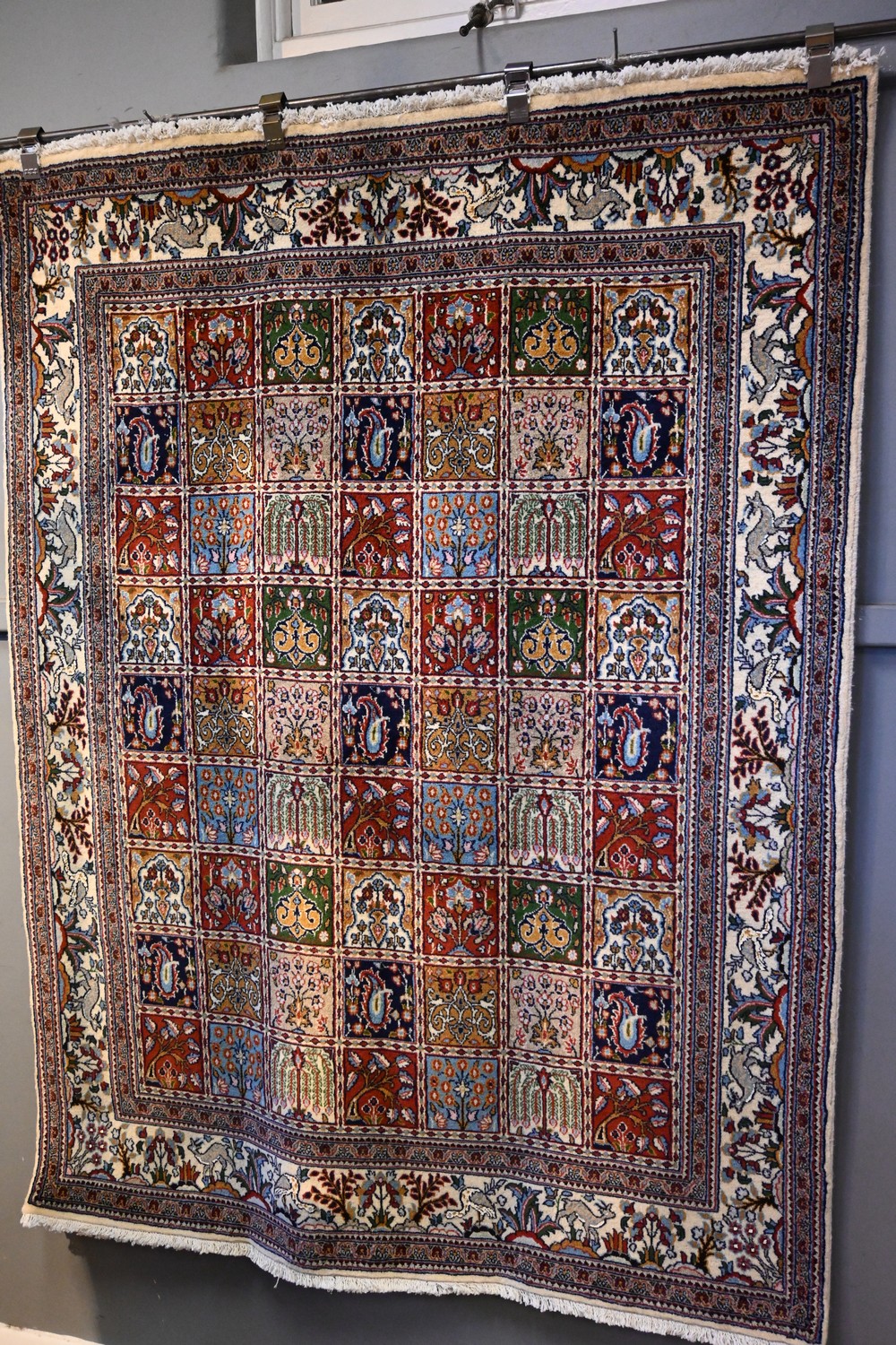 A SUPERFINE PERSIAN BIRJAND MOOD CARPET, 100% WOOL & SILK INLAYS. SOLID, LUSTROUS VELVET PILE. CLASSIC MOOD PICTORIAL GARDEN DESIGN OF PANELS CONTAINING GARDEN THEMES OF WILLOW TREES, FLORAL FOLIAGE, FLORAL SHRUBS & PAISLEYS. BORDER OF FLORAL SHRUBS, DEER AND BIRD FORM. SIZE: 198 X 152CM DOCUMENTATION OF AUTHENTICITY INCLUDED. ORIGIN: IRAN – RRP: $4,900