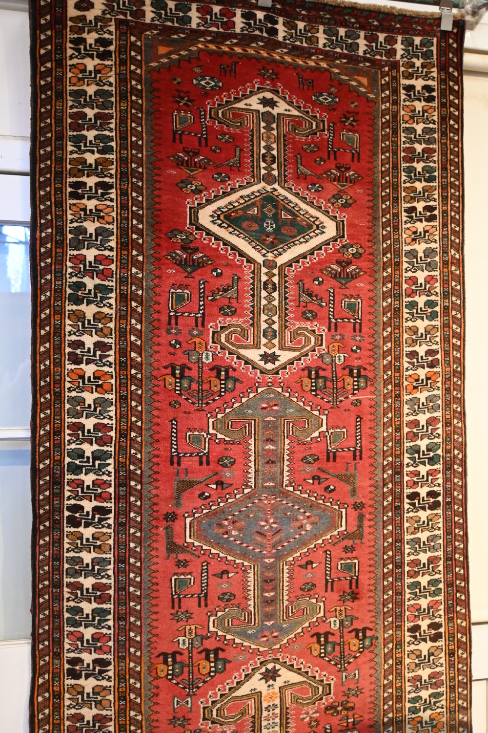 A HARD TO COME BY FINE PERSIAN NASRABAD HALL RUNNER, 100% FINE WOOL, WOVEN ON A WOOL FOUNDATION. FINELY HAND-KNOTTED. DENSE WOOL PILE. SOLID & HARD-WEARING. TRIBAL DESIGN OF REPEATING ANCHORED MEDALLIONS IN A RED FIELD OF TREE OF LIFE PATTERNS, ROSETTES & ANIMAL AND PEACOCK FORMS. BORDER OF TRIBAL FLOWERS. EX-GALLERY DISPLAYED CARPET. IN EXCELLENT CONDITION. DOCUMENTATION OF AUTHENTICITY INCLUDED. SIZE: 385 X 110CM ORIGIN: PERSIA – RRP: $4,900