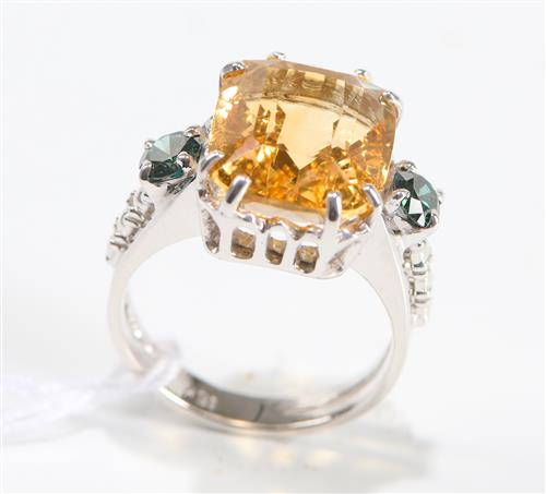 A CITRINE AND GREEN DIAMOND SET RING IN 18CT WHITE GOLD, THE CITRINE WEIGHING 6.65CTS AND THE GREEN DIAMONDS WEIGHING 0.50CTS, SIZE K