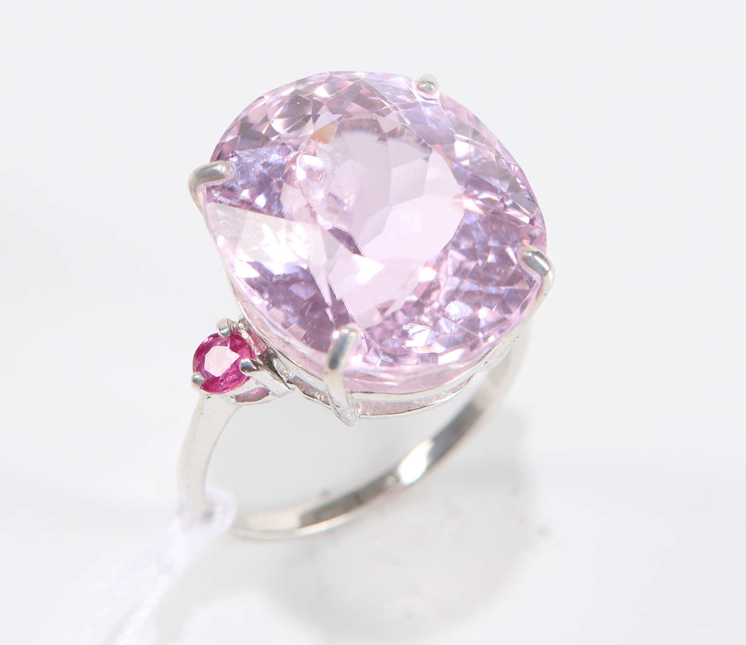 A KUNZITE AND RUBY SET RING IN 18CT WHITE GOLD, THE KUNZITE WEIGHING 21.18CTS, SIZE K