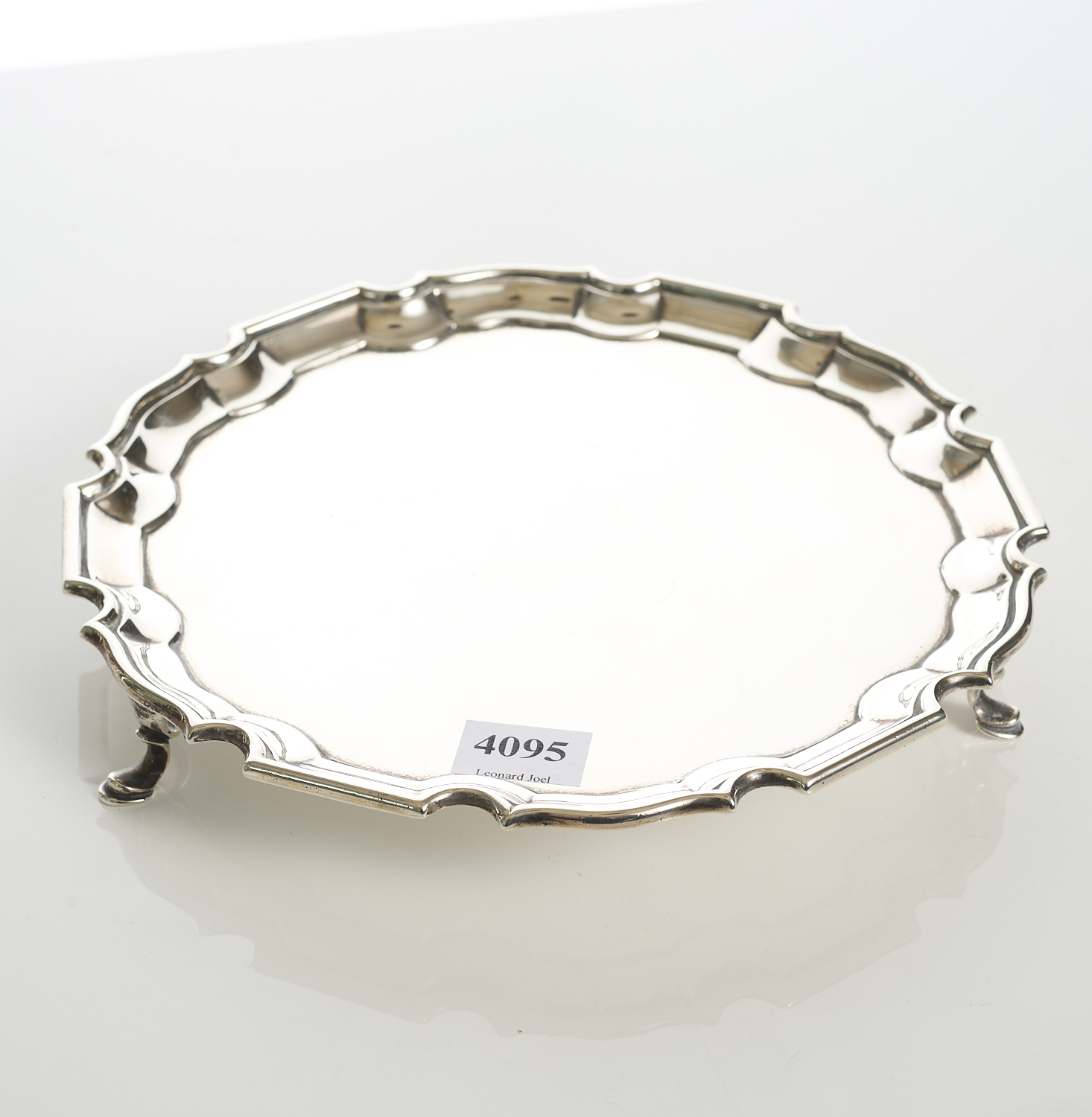 A STERLING SILVER SALVER WITH PIE CRUST EDGE ON THREE HOOF FEET, HALLMARKED LONDON 1908 BY C S HARRIS AND SONS, 365 GRAMS, DIA.21CM, LEONARD JOEL LOCAL DELIVERY SIZE: SMALL