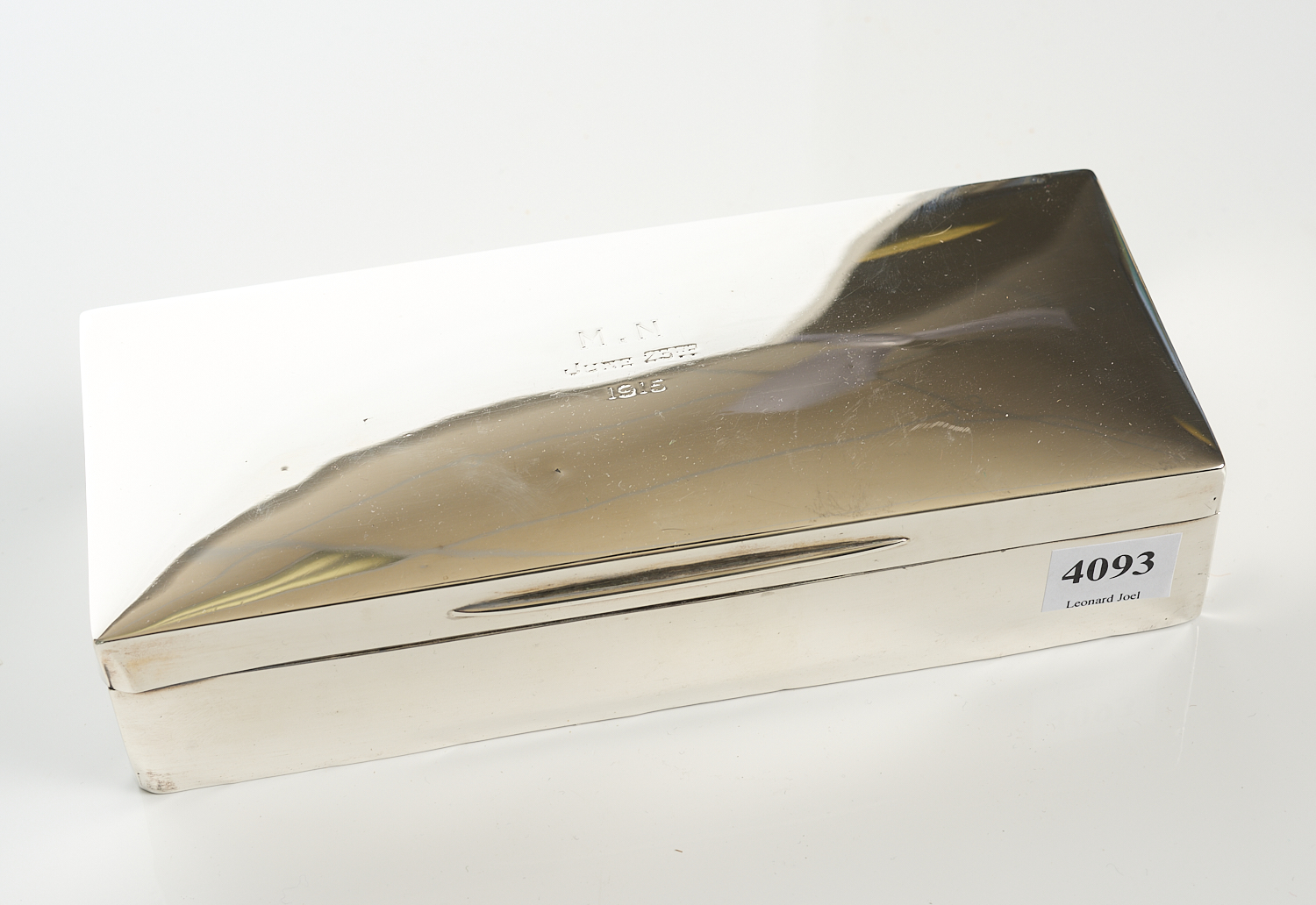 A STERLING SILVER WOODEN LINED CIGAR BOX H.4.5CM X W.20.5CM X D.8.5CM, LEONARD JOEL LOCAL DELIVERY SIZE: SMALL