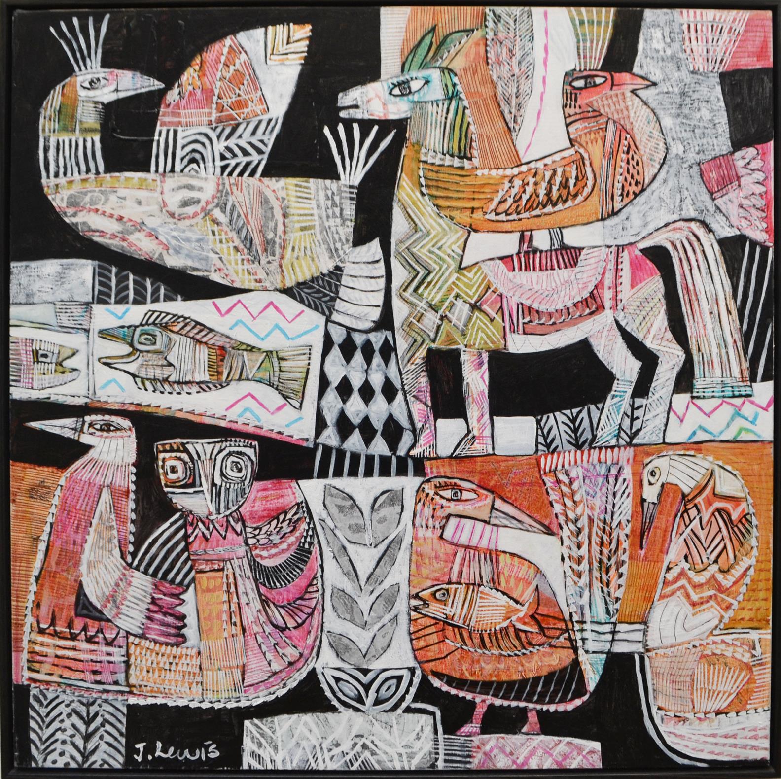 JILL LEWIS, BIRDS WHO PERFORM, ACRYLIC ON CANVAS, 100 X 100CM