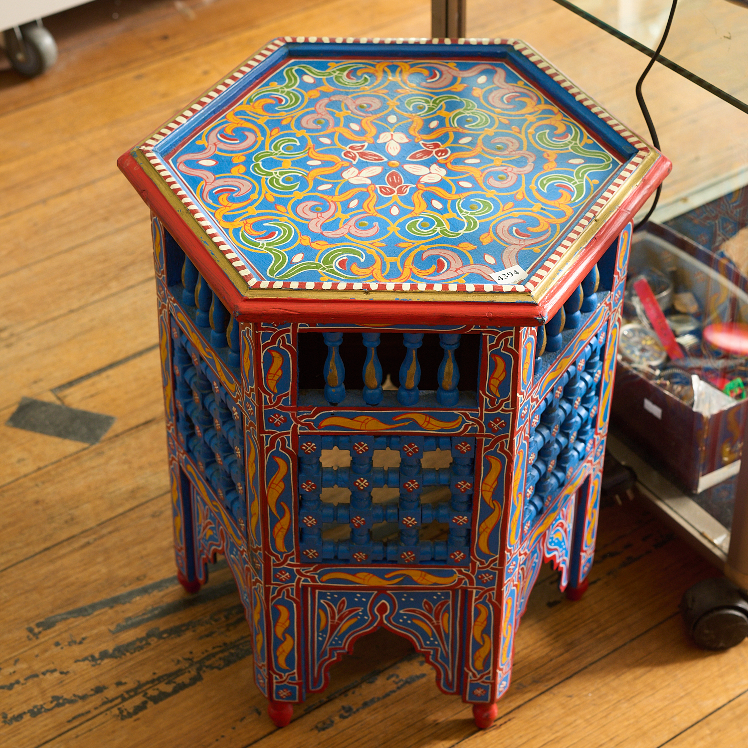 AN INDIAN STYLE WOODEN SIDE TABLE WITH PAINTED DECORATION AND HEXAGONAL TOP, H. 52CM, LEONARD JOEL LOCAL DELIVERY SIZE: MEDIUM