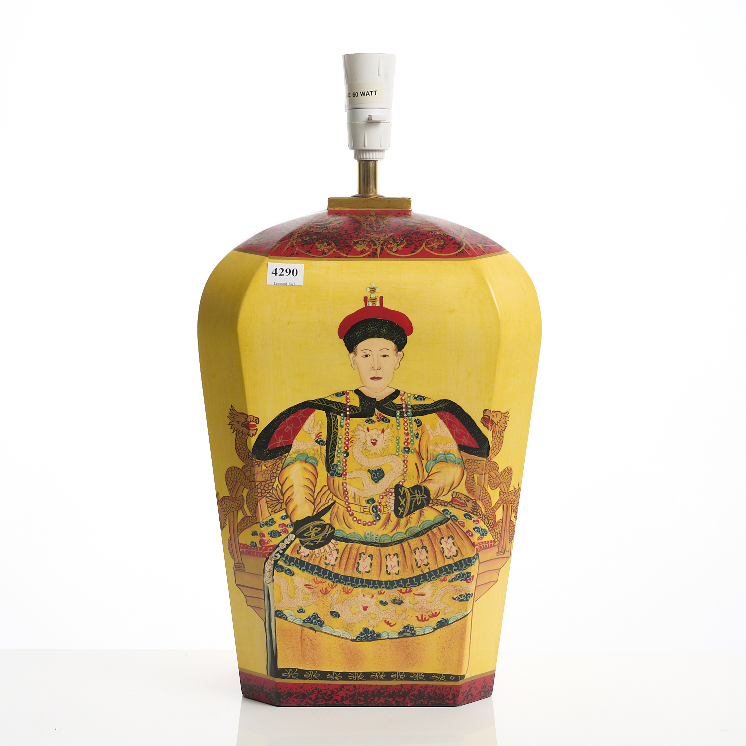 A TABLE LAMP WITH CHINESE EMPEROR DECORATION H.48CM, LEONARD JOEL LOCAL DELIVERY SIZE: MEDIUM