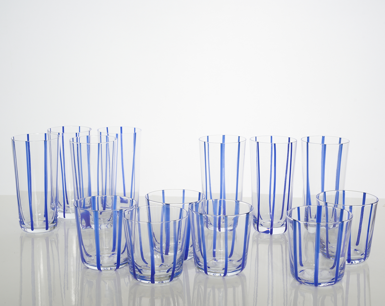 A GROUP OF HAND BLOWN GLASSWARE WITH STRIPED DECORATION - 7 TALL AND 6 SHORT GLASSES, LEONARD JOEL LOCAL DELIVERY SIZE: MEDIUM