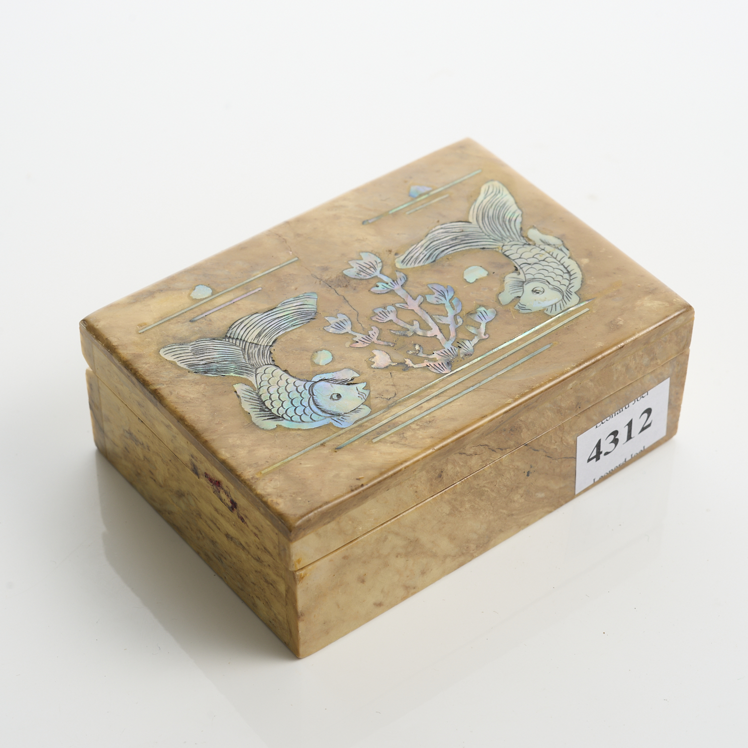 A HARD STONE BOX WITH MOTHER OF PEARL DECORATION H.4CM X W.10CM X D.7CM, LEONARD JOEL LOCAL DELIVERY SIZE: SMALL