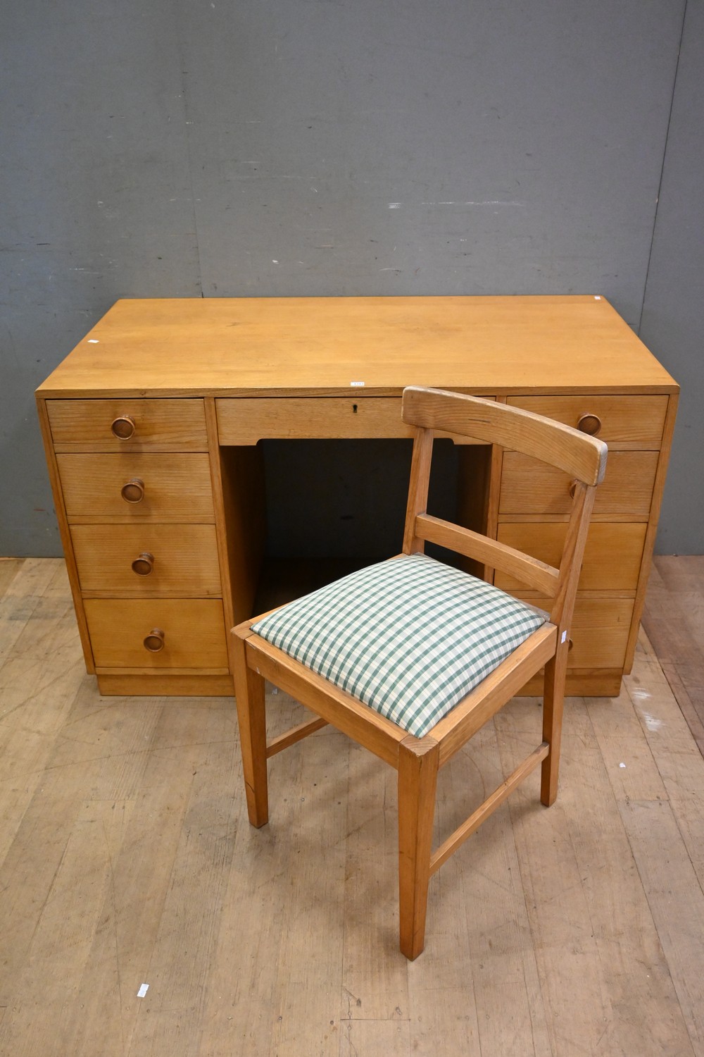 A MID-CENTURY NINE DRAWER DESK WITH CHAIR (A/F) (76H x 122W x 63D CM) (PLEASE NOTE THIS HEAVY ITEM MUST BE REMOVED BY CARRIERS AT THE CUSTOMER'S EXPENSE. LEONARD JOEL STAFF CANNOT ASSIST CARRYING THIS ITEM) (X-LARGE ITEM)
