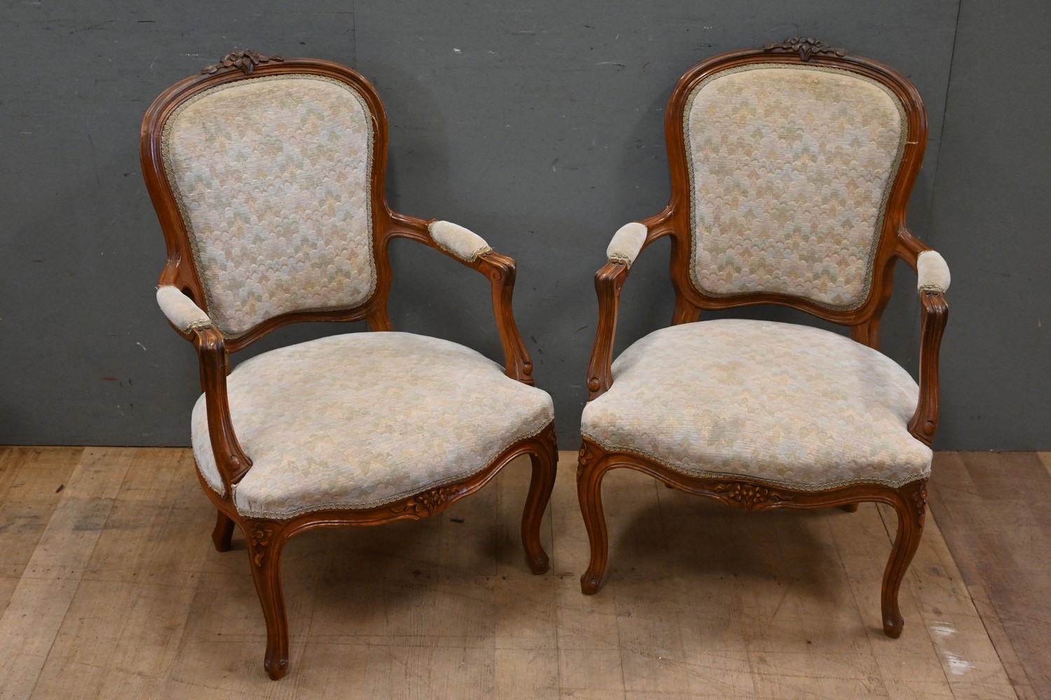 A PAIR OF ANTIQUE LOUIS XV STYLE ARMCHAIRS (A/F) (89H x 60W x 59D CM) (LEONARD JOEL DELIVERY SIZE: LARGE)