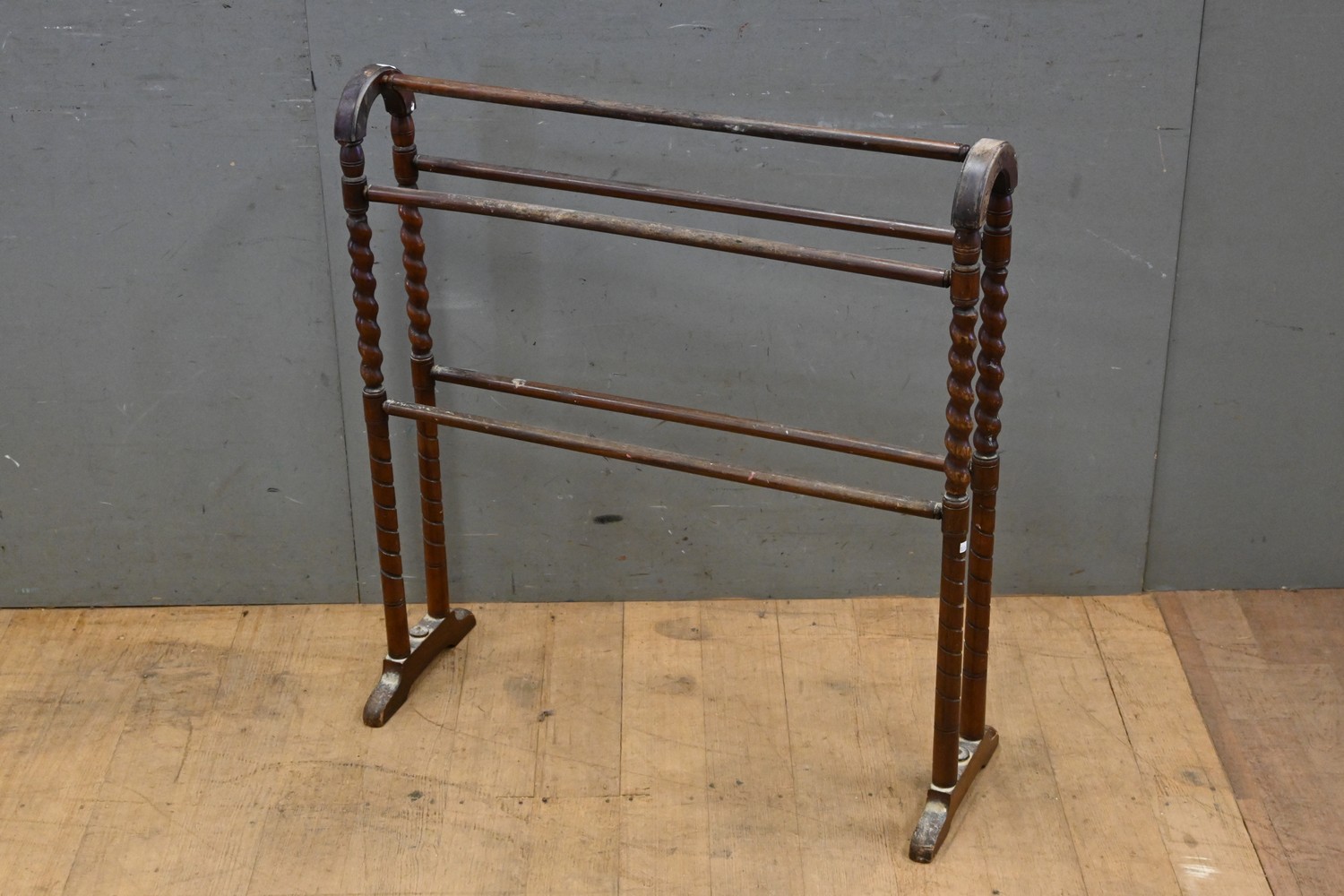 A TIMBER TOWEL RACK WITH BARLEY TWIST (A/F) (84H x 77W x 27D CM) (LEONARD JOEL DELIVERY SIZE: MEDIUM)