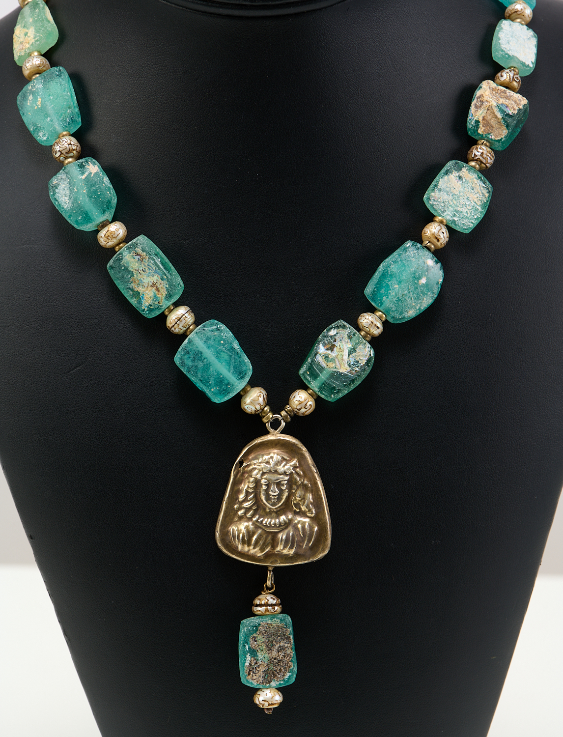 AN ANTIQUE PENDANT IN SILVER TO A ROMAN GLASS NECKLACE BY ANDREA WARD, LENGTH APPROXIMATELY 490MM