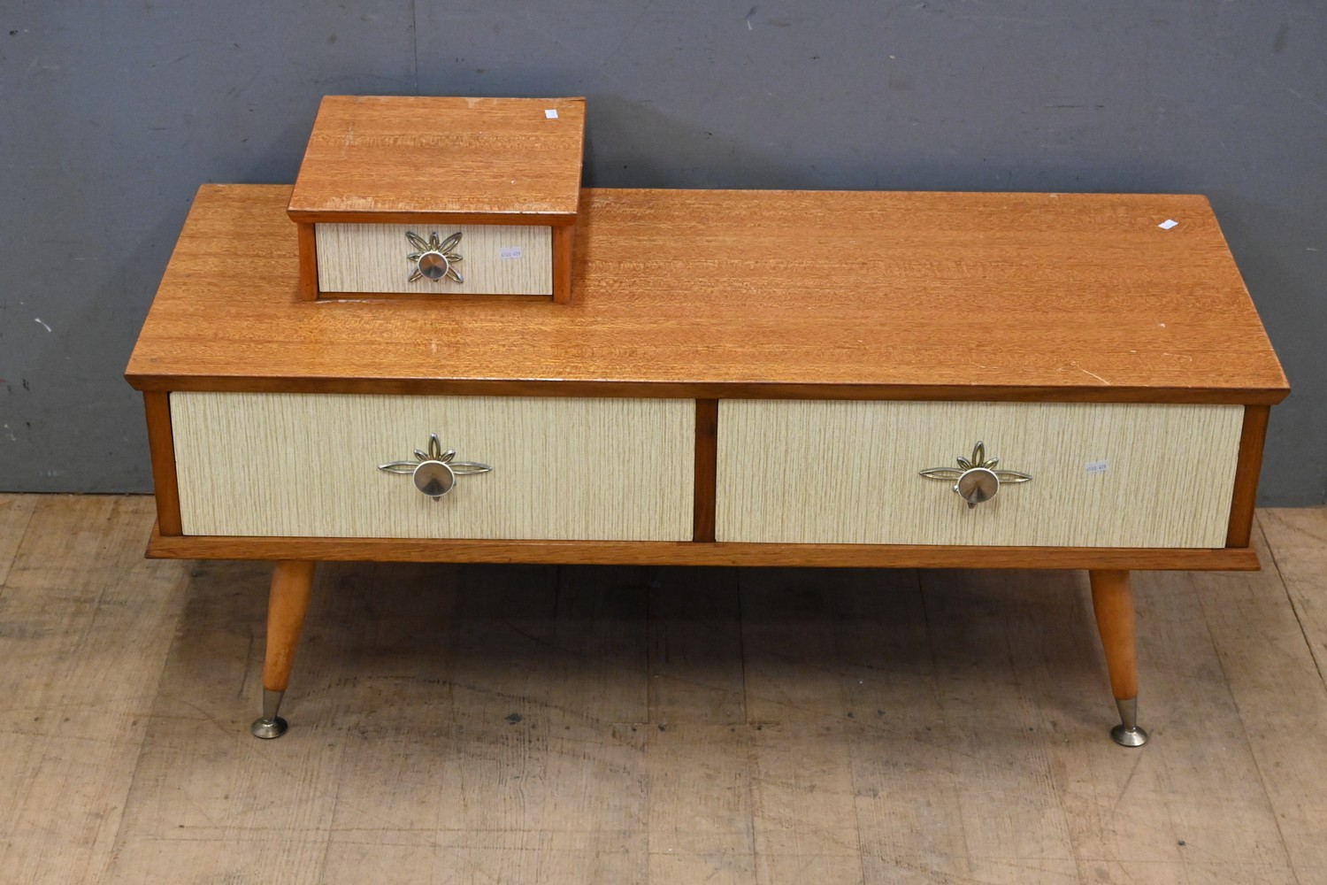A RETRO MID CENTURY AUSTRALIAN 1950S THREE DRAWER SIDE CABINET WITH BULLET LEGS (55H x 114W x 45D CM) (LEONARD JOEL DELIVERY SIZE: LARGE)