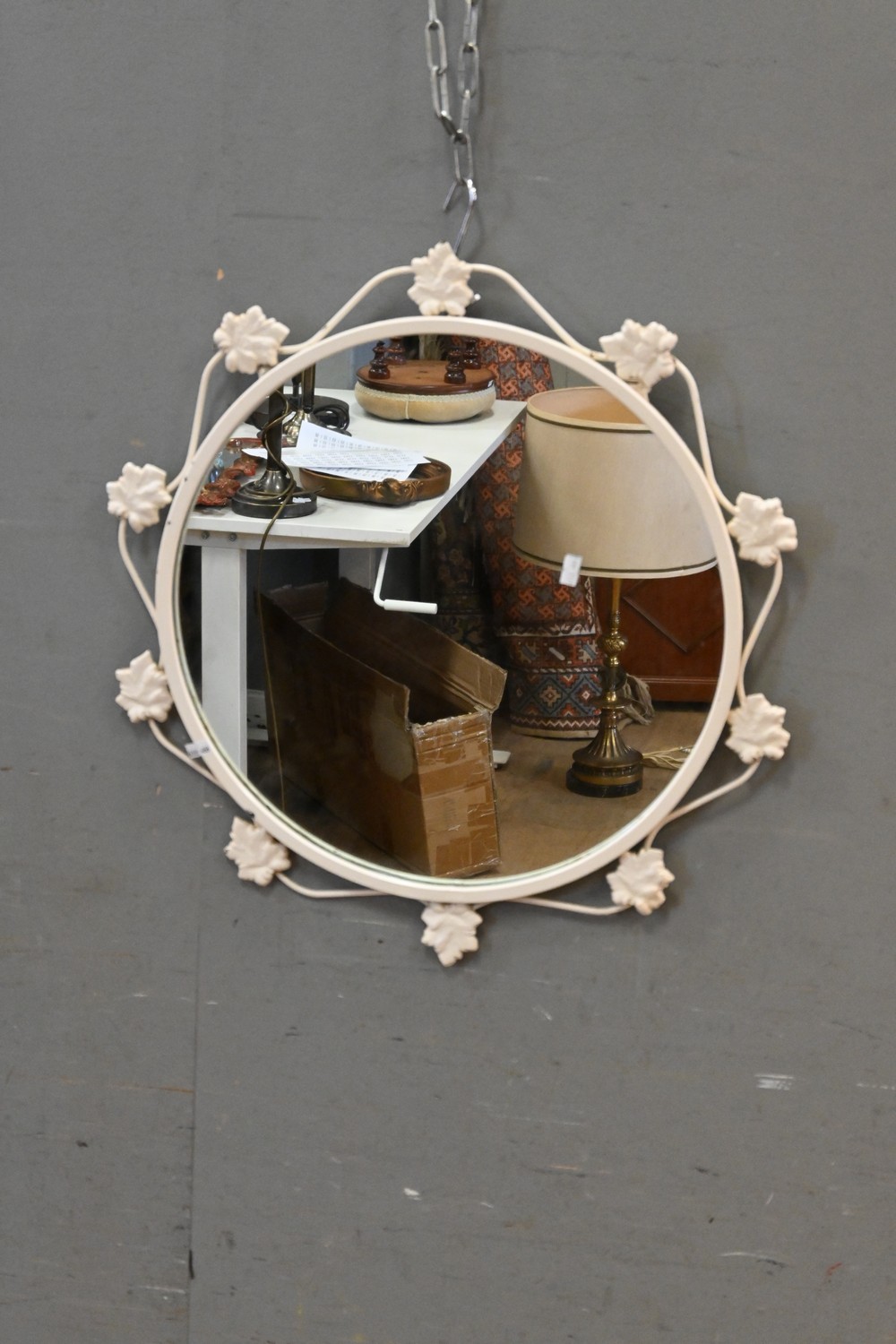 A 1940S CAST IRON PAINTED WHITE FLOWER DETAILED CIRCULAR MIRROR (58D CM) (LEONARD JOEL DELIVERY SIZE: MEDIUM)