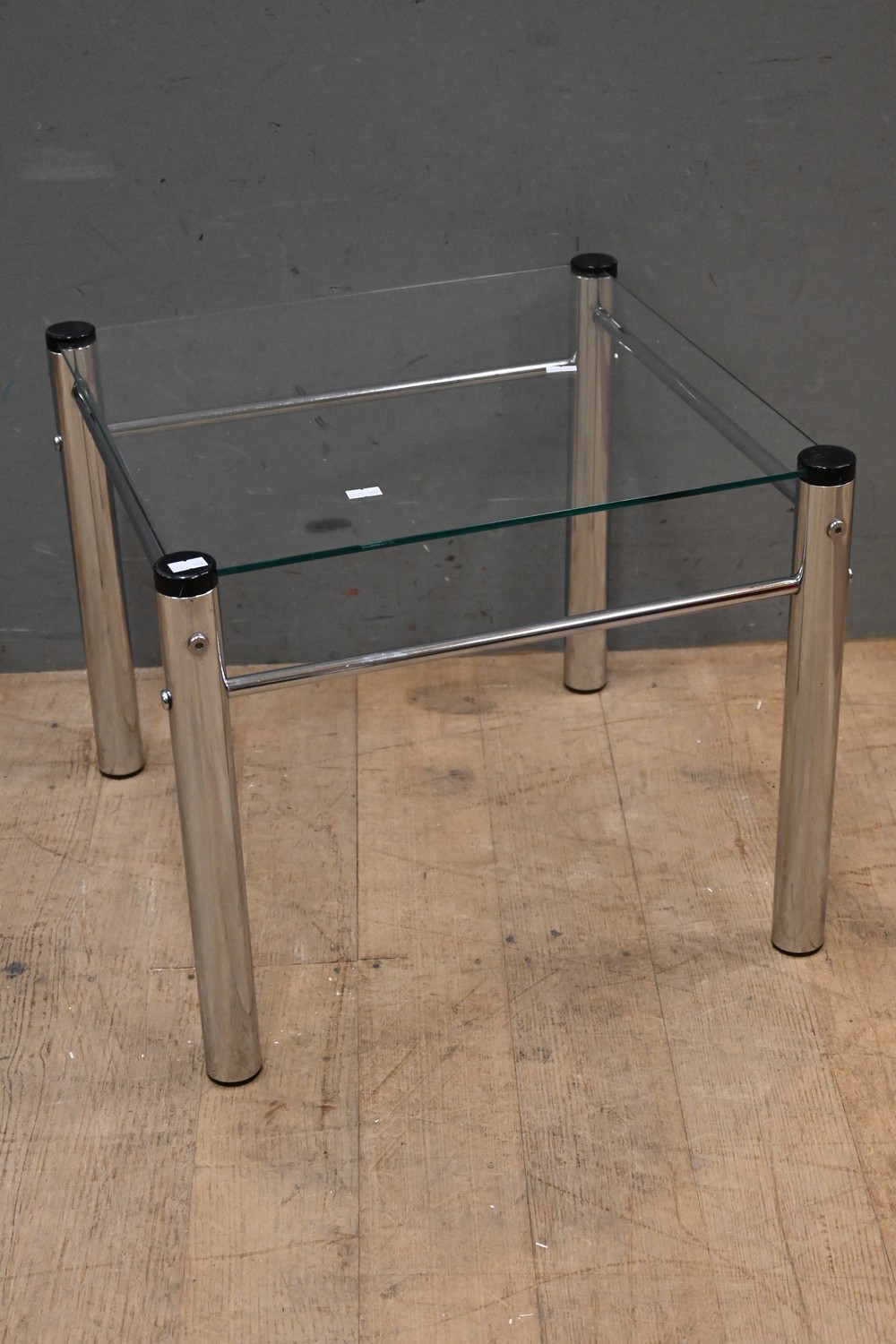 A CHROME AND GLASS TOPPED SQUARE COFFEE TABLE (39H X 46W X 46D CM) (LEONARD JOEL DELIVERY SIZE: MEDIUM)