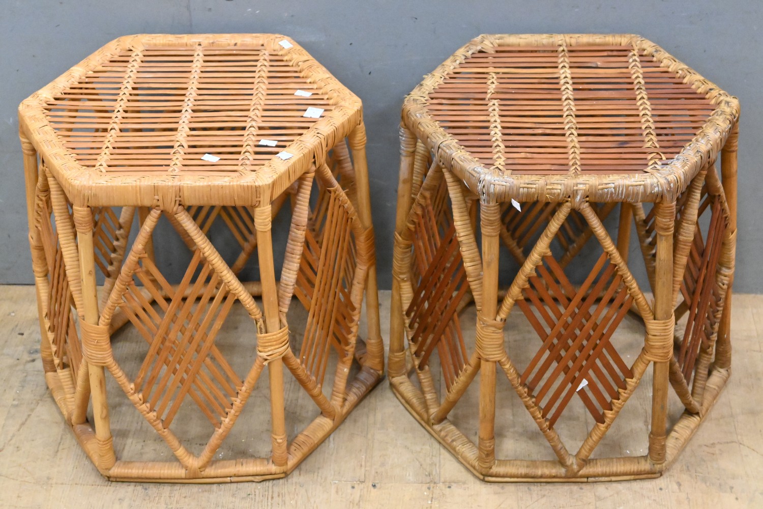 A PAIR OF RETRO AUSTRALIAN MADE CANE SIDE TABLES ( 48H X 46 W CM) (LEONARD JOEL DELIVERY SIZE: MEDUM)