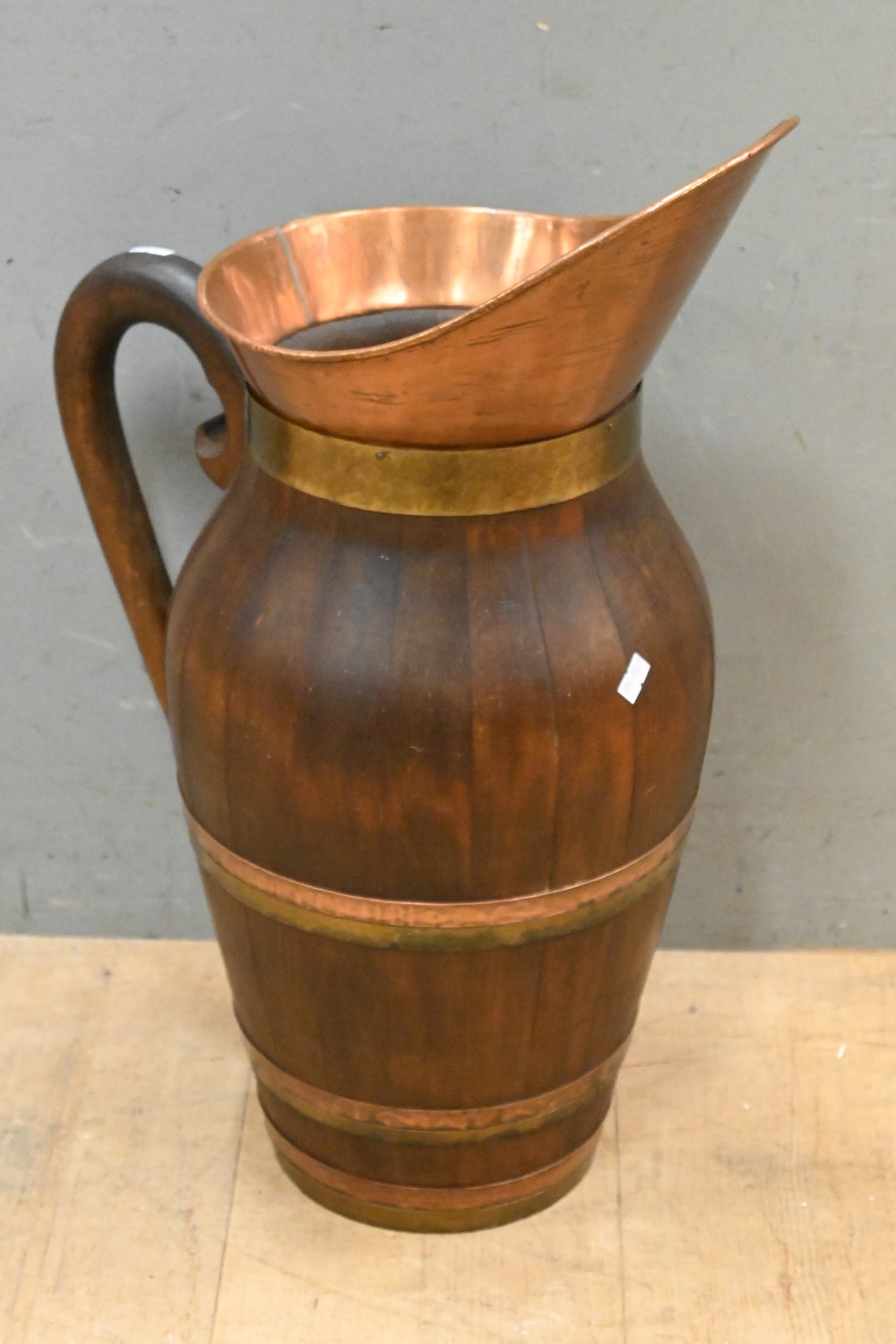 A LARGE FRENCH COOPERED WOODEN AND BRASS TAVERN JUG ( 63H X 46W CM) (LEONARD JOEL DELIVERY SIZE: LARGE)
