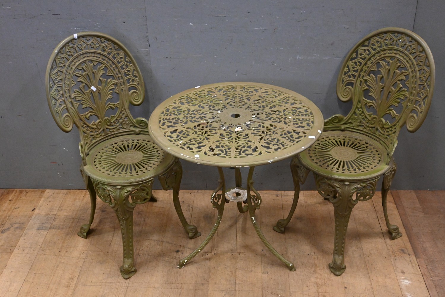 AN EARLY 20TH CENTURY PAINTED GREEN CAST IRON 3 PIECE GARDEN PATIO SET (64H x 64D CM) (LEONARD JOEL DELIVERY SIZE: LARGE)