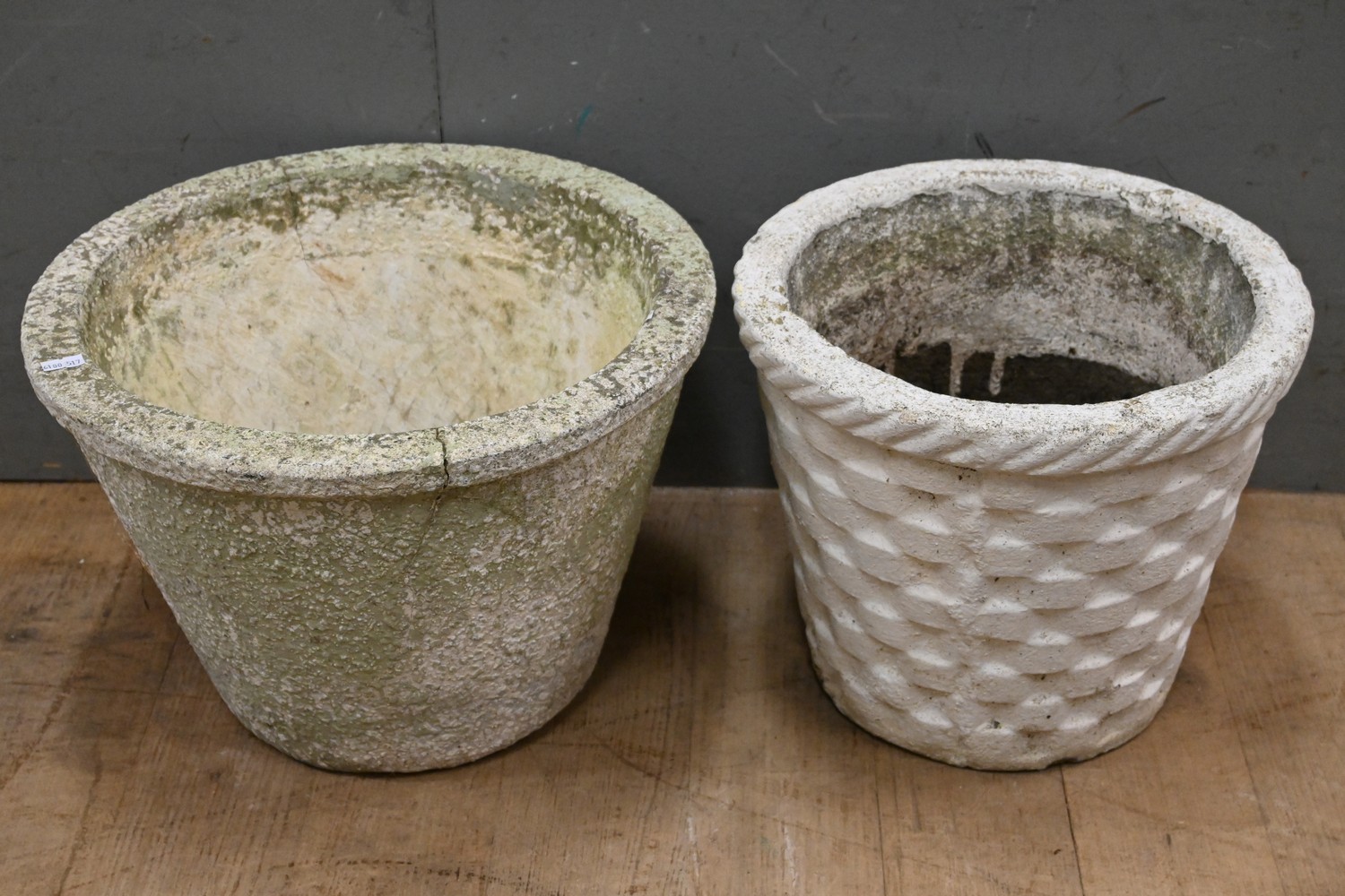 TWO RETRO CONCRETE GARDEN POTS - ONE WOVEN PATTERN THE OTHER STIPPLED ( 27H X 38 DIAMETER CM) (LEONARD JOEL DELIVERY SIZE: LARGE)