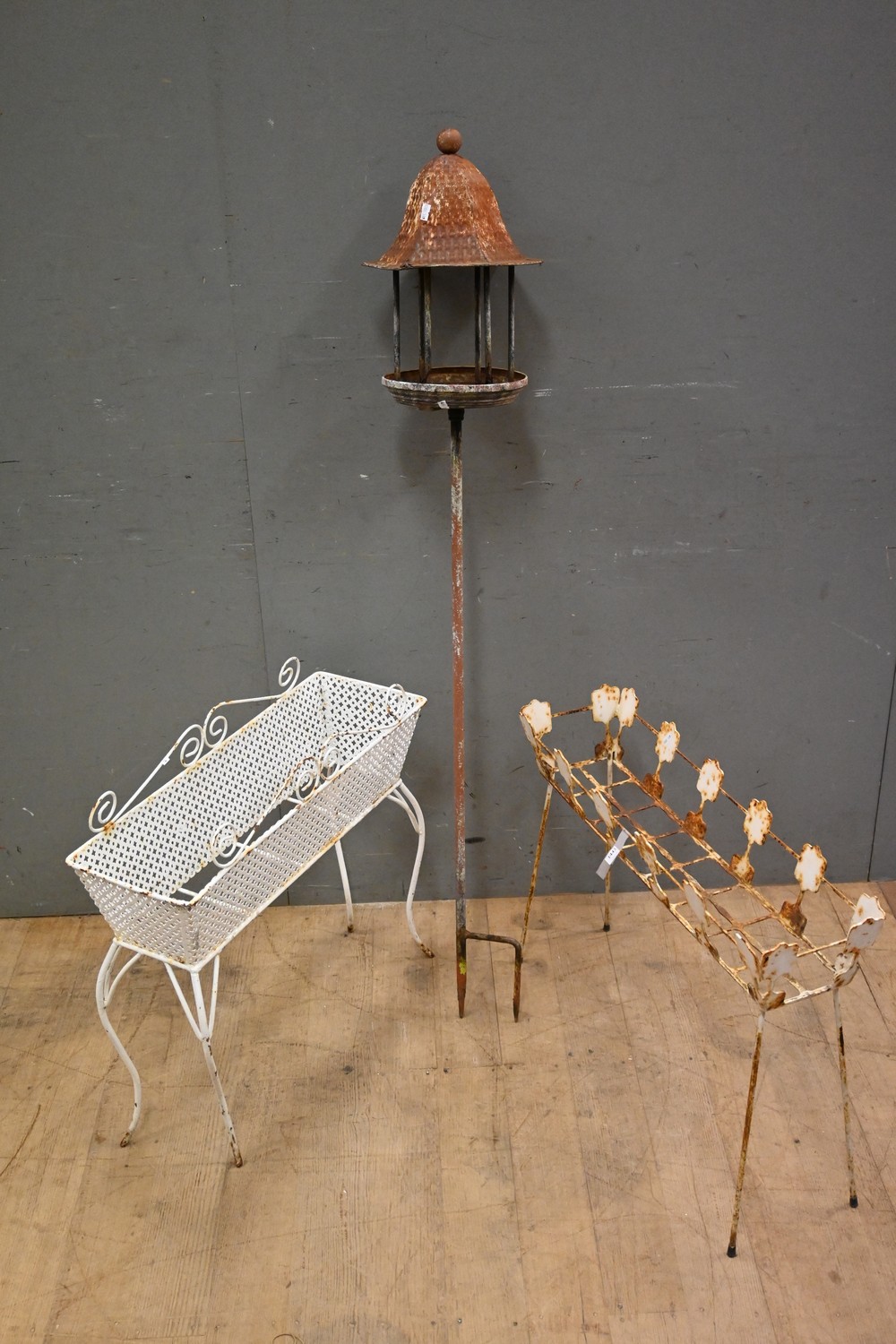 A GROUP OF THREE VINTAGE WROUGHT IRON OUTDOOR PLANTERS AND METAL BIRD FEEDER (A/F) (FEEDER 142H CM) (LEONARD JOEL DELIVERY SIZE: LARGE)
