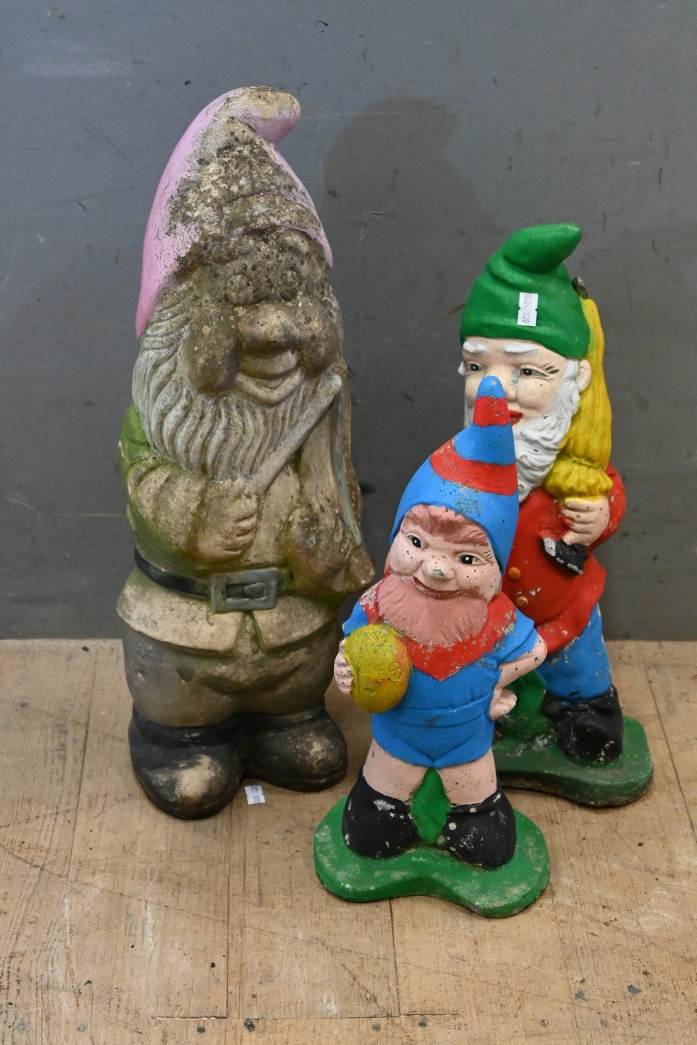GROUP OF THREE VINTAGE PAINTED CONCRETE GARDEN GNOMES (49H CM) (LEONARD JOEL DELIVERY SIZE: LARGE)