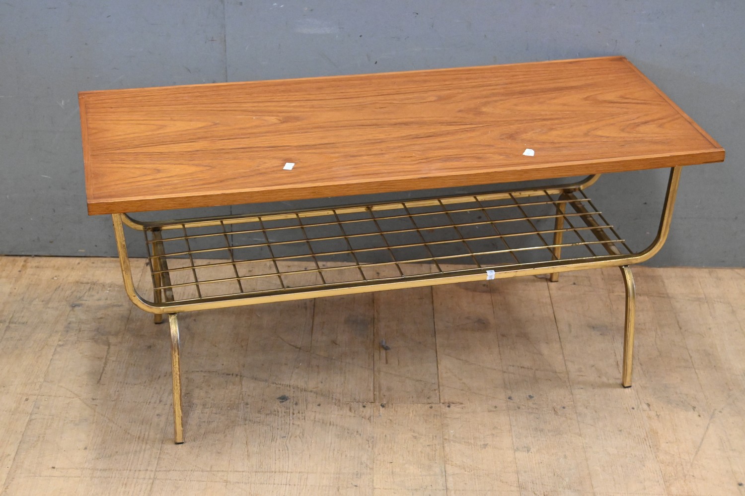 A TEAK TOPPED AND GILDED METAL BASED COFFEE TABLE WITH LOWER MAGAZINE RACK (43H x 93W x 41D CM) (LEONARD JOEL DELIVERY SIZE: LARGE)