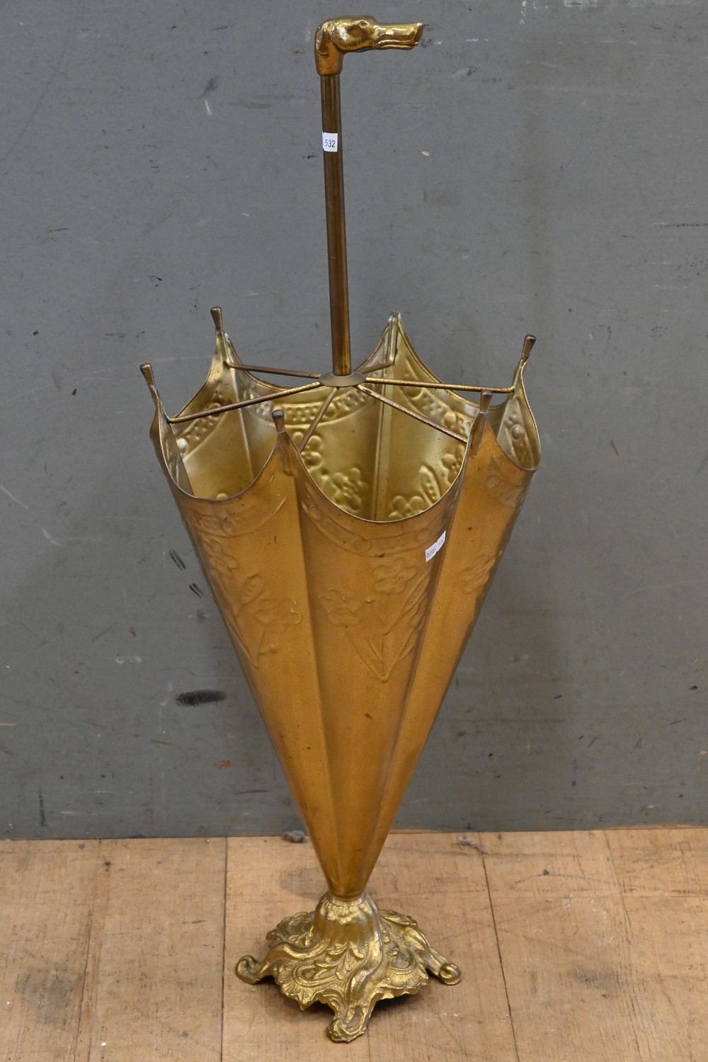 A FRENCH SOLID BRASS UMBRELLA FORM UMBRELLA STAND WITH DOG HANDLE (70H CM) (LEONARD JOEL DELIVERY SIZE: MEDIUM)