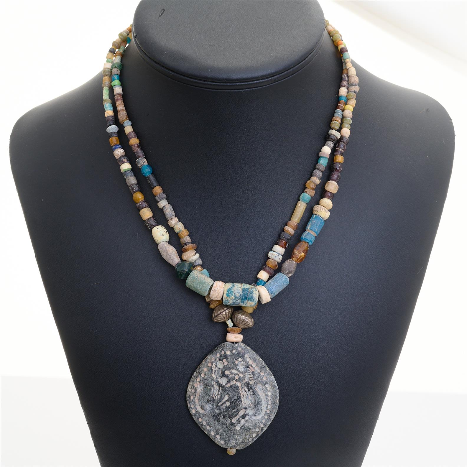 A MULTI COLOURED ROMAN GLASS BEADED NECKLACE BY ANDREA WARD, FEATURING A CENTRAL STONE PENDANT, THE PENDANT MEASURING APPROXIMATELY 52 X 41MM