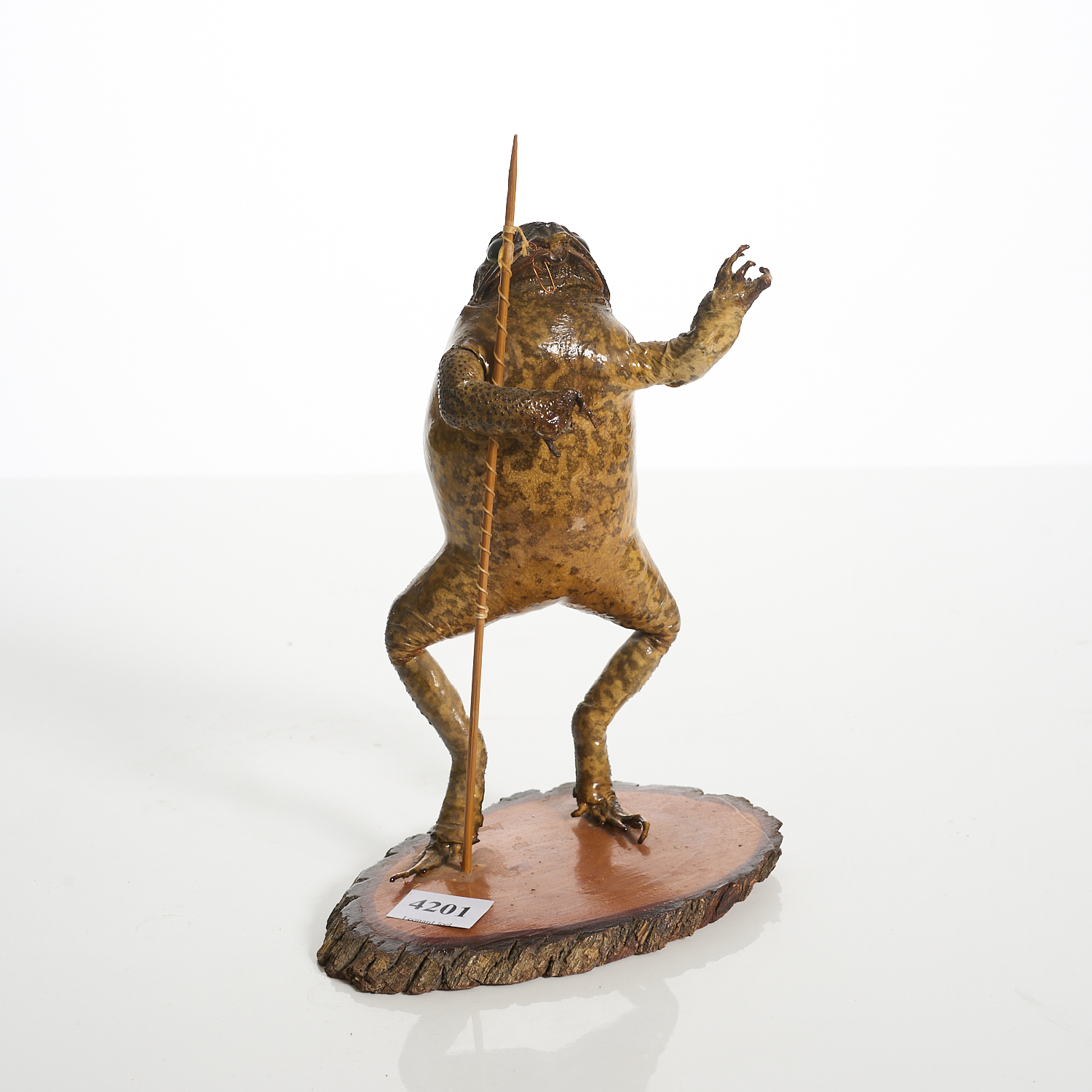 AN UNUSUAL TAXIDERMY STANDING CANE TOAD WITH FISHING ROD H.23CM, LEONARD JOEL LOCAL DELIVERY SIZE: SMALL