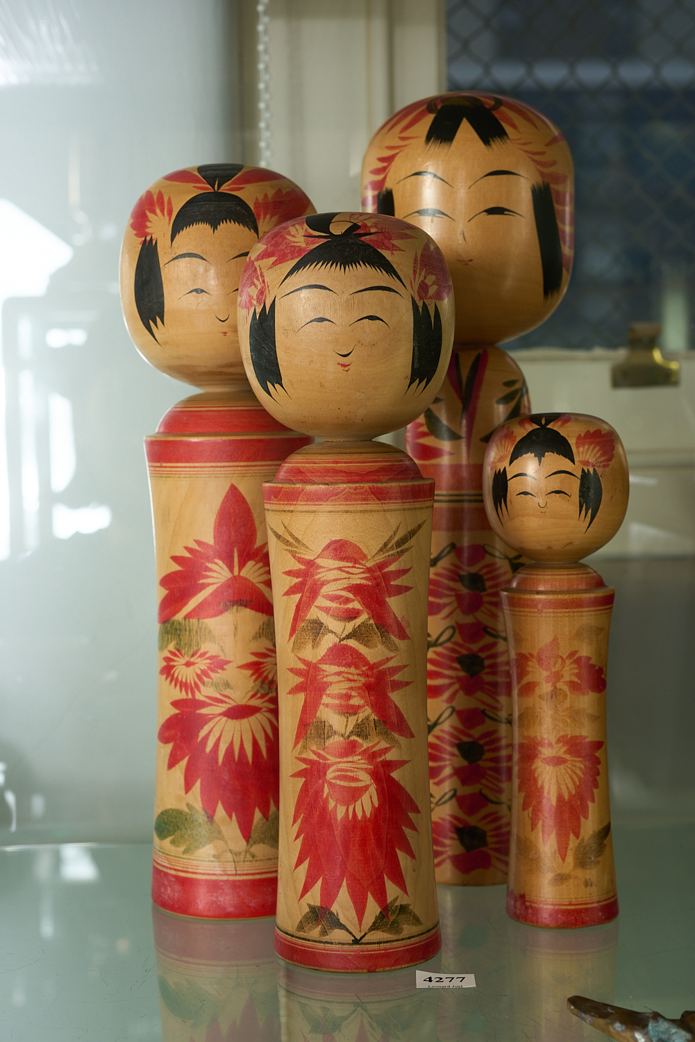 A GROUP OF FOUR JAPANESE WOODEN KOKESHI DOLLS, LEONARD JOEL LOCAL DELIVERY SIZE: MEDIUM