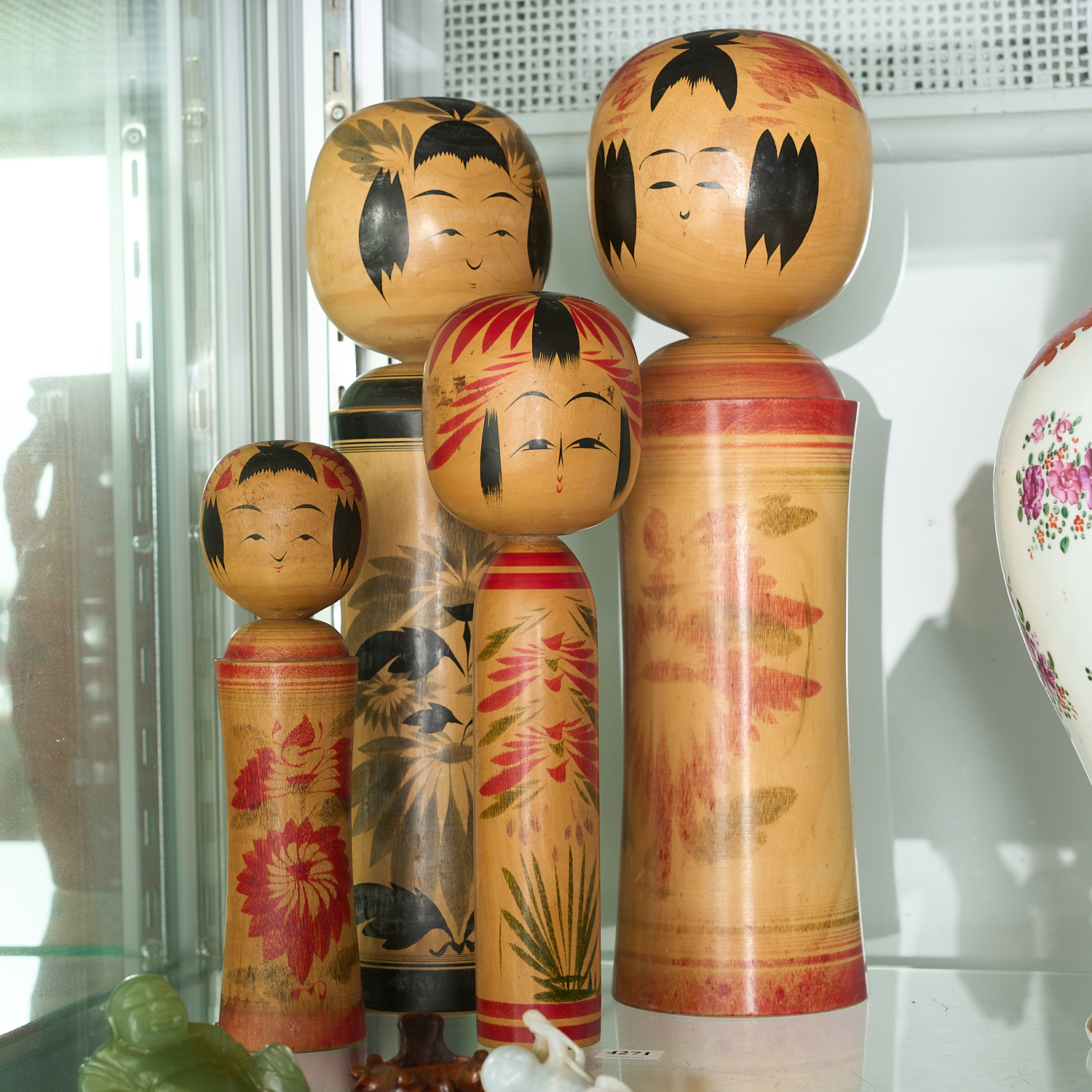 A GROUP OF FOUR JAPANESE WOODEN KOKESHI DOLLS, LEONARD JOEL LOCAL DELIVERY SIZE: MEDIUM