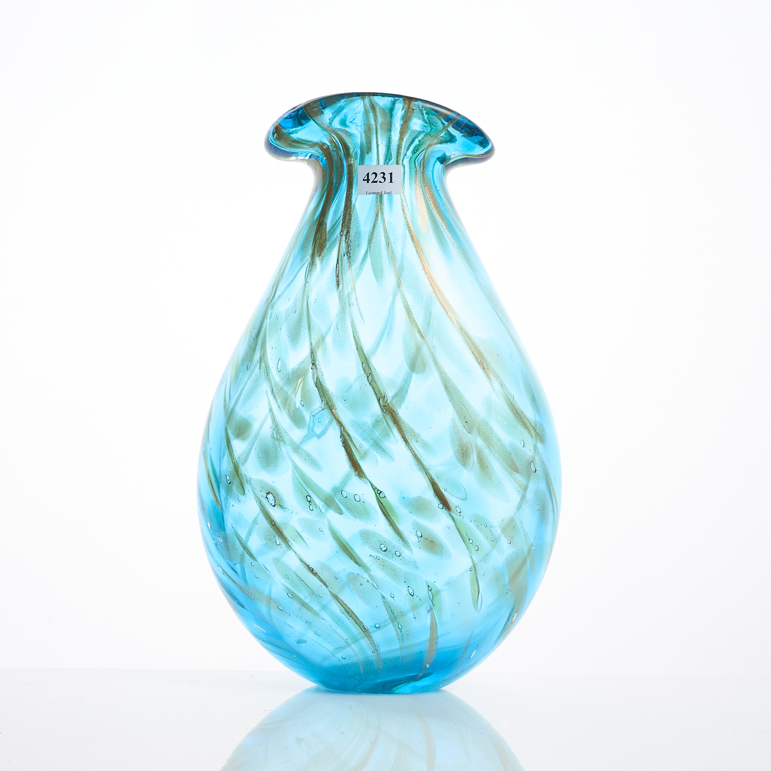 AN AQUA GLASS VASE WITH GOLD FOIL INCLUSIONS H.35CM, LEONARD JOEL LOCAL DELIVERY SIZE: MEDIUM