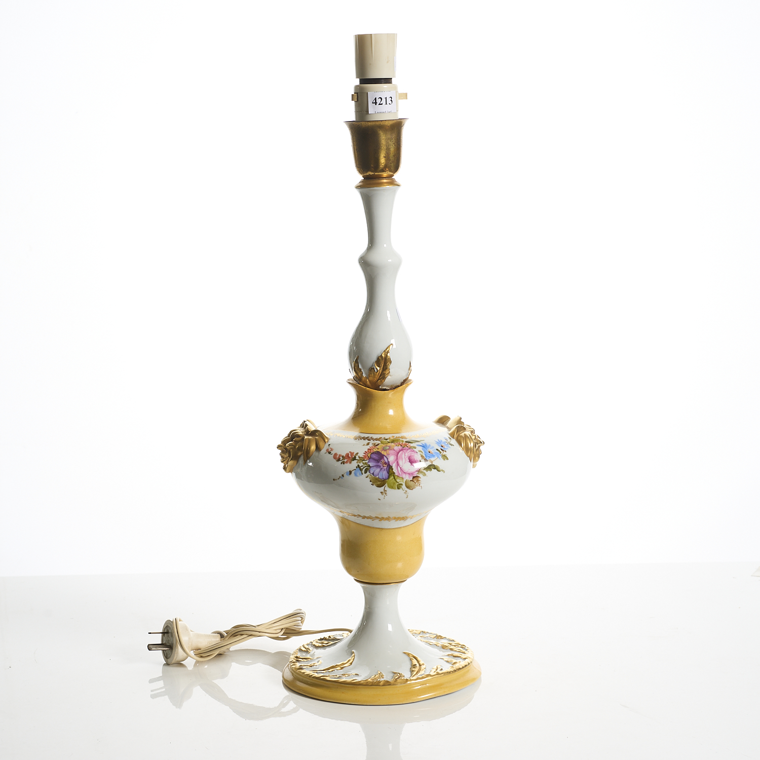 AN ITALIAN GILDED CERAMIC LAMP WITH FIGURAL DETAILS AND HAND PAINTED FLOWERS H.54.5CM, LEONARD JOEL LOCAL DELIVERY SIZE: MEDIUM