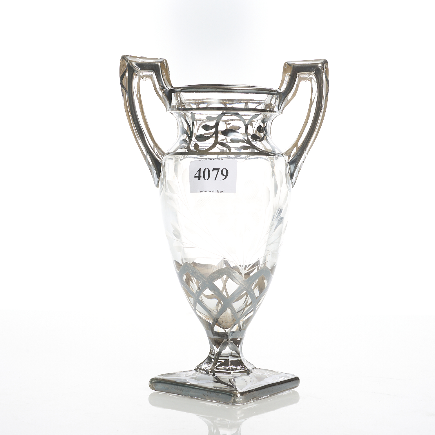 AN ART DECO ETCHED GLASS AND SILVER PAINTED VASE H.18CM, LEONARD JOEL LOCAL DELIVERY SIZE: SMALL