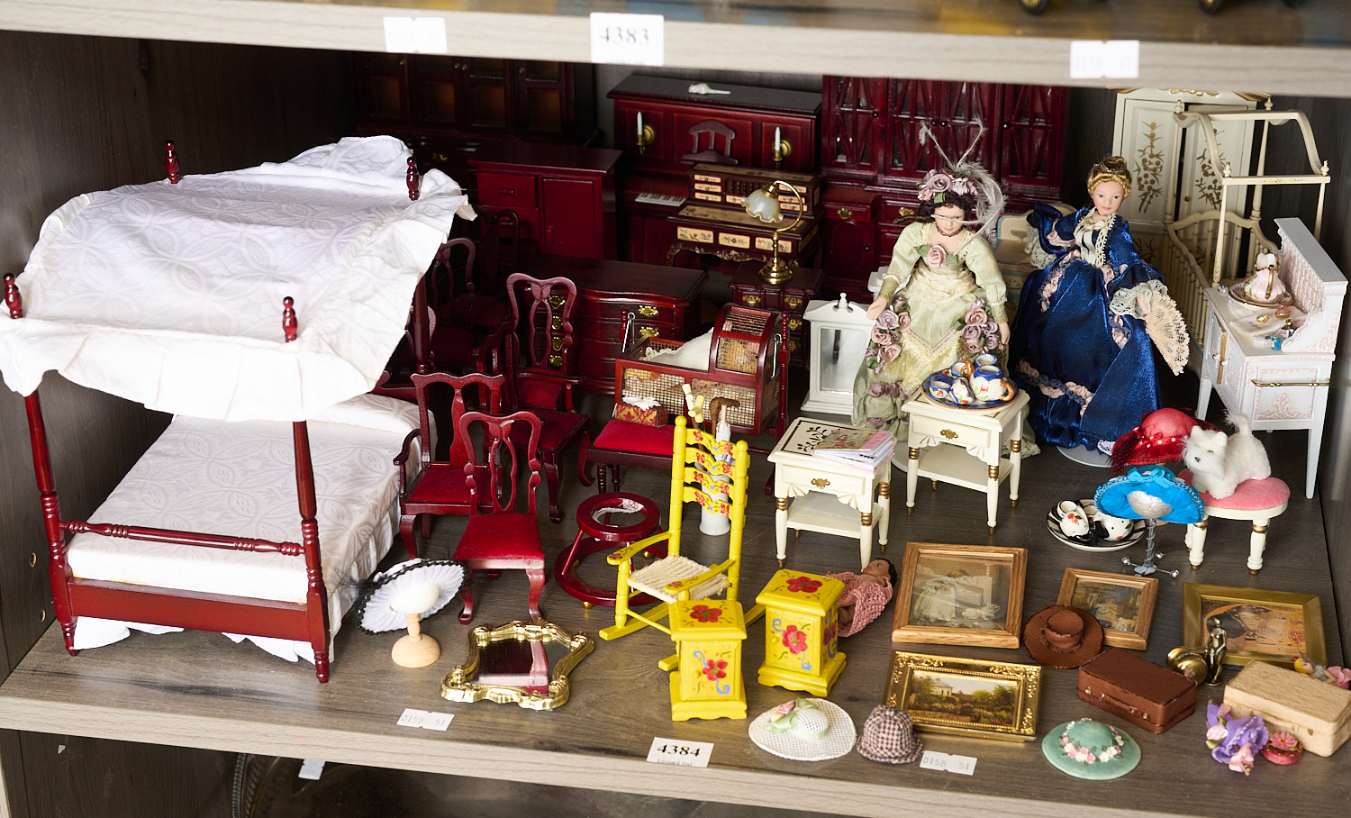 A SHELF OF DOLLS HOUSE FURNITURE, LEONARD JOEL LOCAL DELIVERY SIZE: MEDIUM