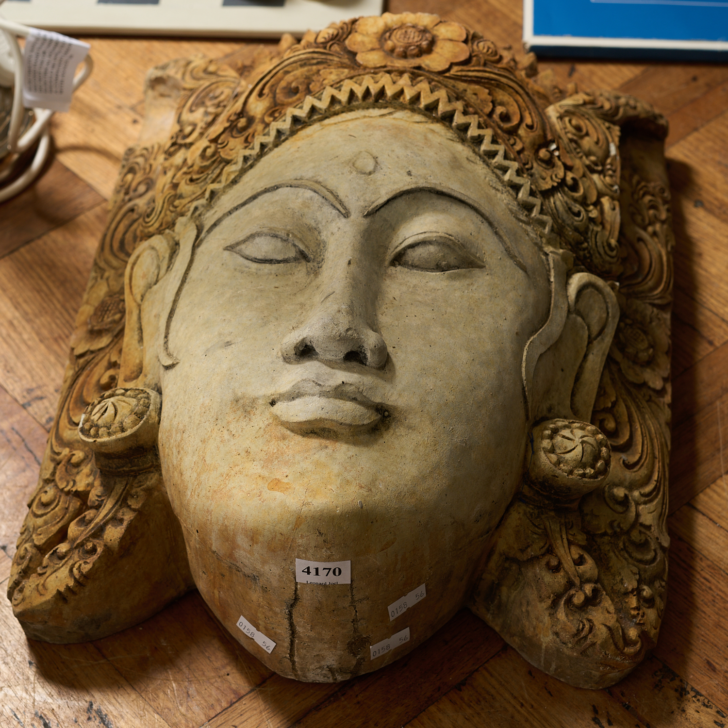A RECONSTITUTED STONE THAI DEITY HEAD H.48CM X W.32CM, LEONARD JOEL LOCAL DELIVERY SIZE: MEDIUM