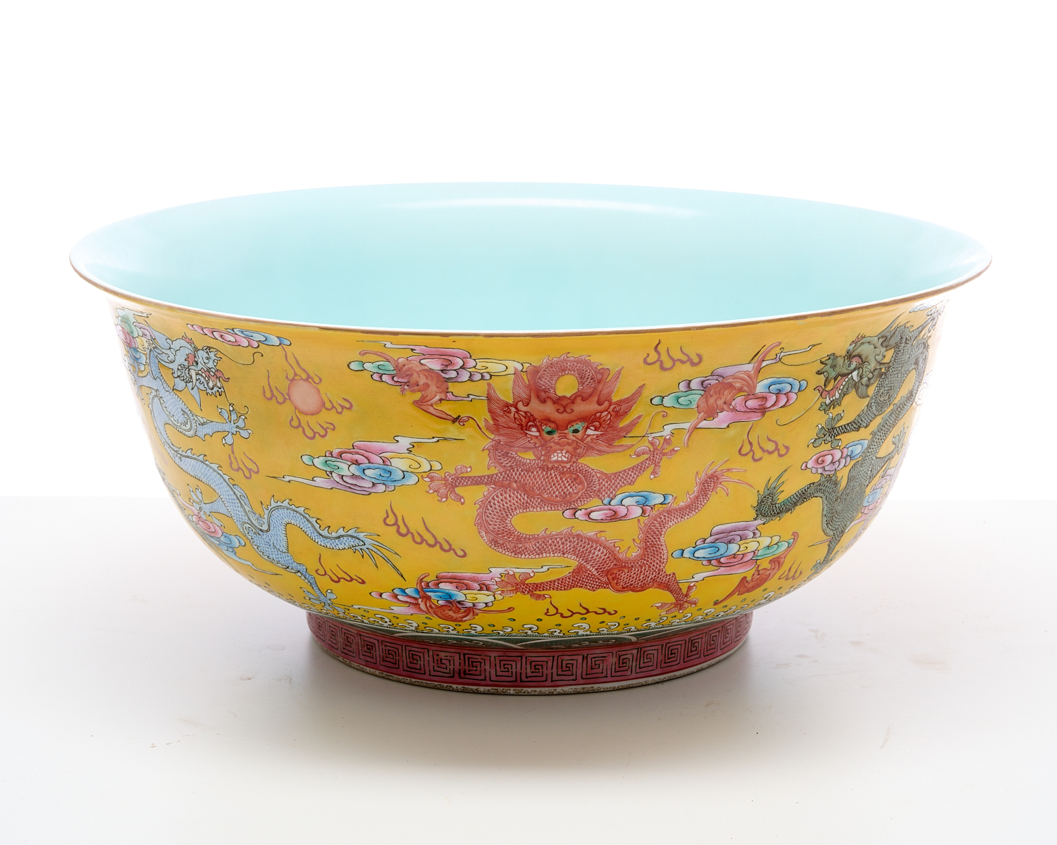 A CHINESE YELLOW GROUND FAMILLE ROSE LARGE BOWL WITH QIANLONG MARK, LEONARD JOEL LOCAL DELIVERY SIZE: SMALL