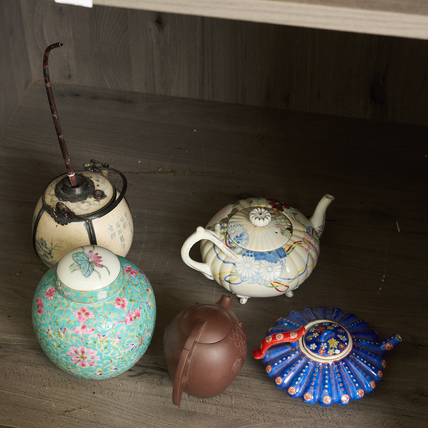 A SHELF OF CHINESE PORCELAIN INCLUDING GINGER JAR AND TEAPOTS, LEONARD JOEL LOCAL DELIVERY SIZE: MEDIUM