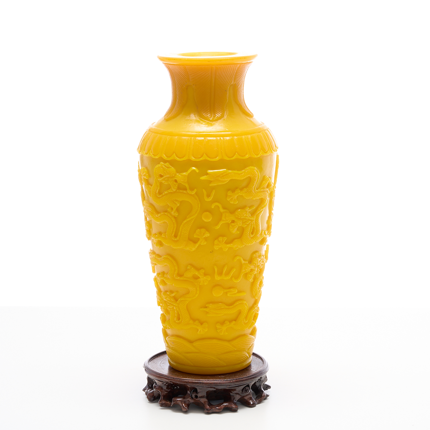 A CHINESE YELLOW GLASS DRAGON VASE, LEONARD JOEL LOCAL DELIVERY SIZE: SMALL